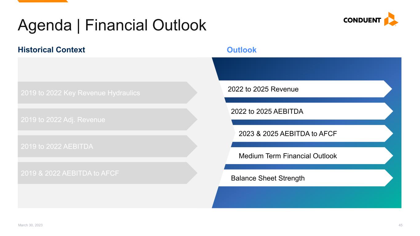 44 Adj. EBITDA to Adj. FCF Walk (Historical, 2019 & 2022) 13% 1.5% Key Takeaways • Capital use is tapering as the initial phases of technology stability programs conclude. • Restructuring primarily reflects data center optimization and early lease surrenders. • Cash taxes are influenced by geographic mix of income and timing of deductions. • Net Working Capital is a drag in the short term due to the timing of cashflows on the revenue replacement cycle. $m $m March 30, 2023
