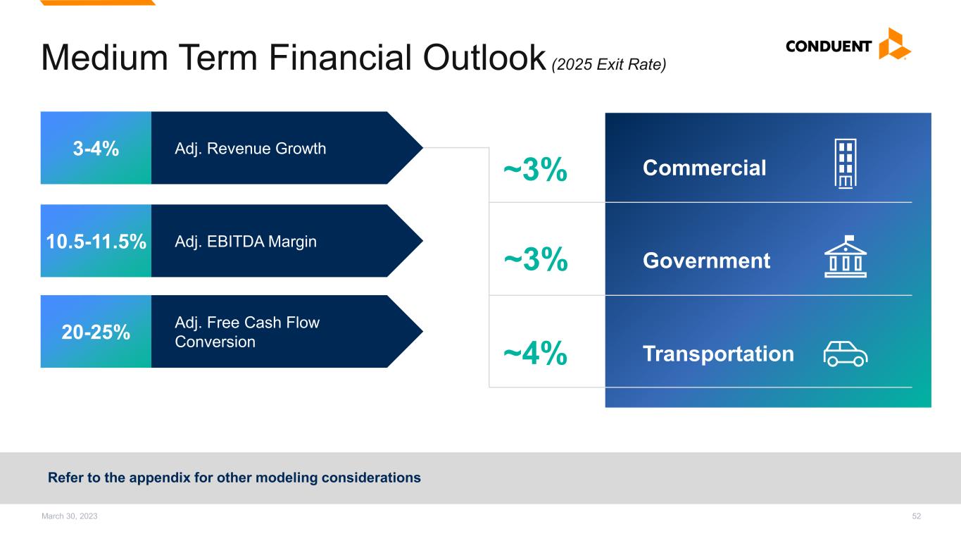 51 Adj. EBITDA to Adj. FCF Walk (Outlook, 2023 & 2025) 20-25% 15-20% Key Takeaways • Capital programs normalize to approximately 4% of revenue. • Restructuring tapers with less burden from data center optimization and real estate. • Cash taxes in 2023 are lower due to the expected Federal Refund and are also influenced by geographic mix of income and timing of deductions. • Net Working Capital is a drag from revenue growth. $m $m March 30, 2023