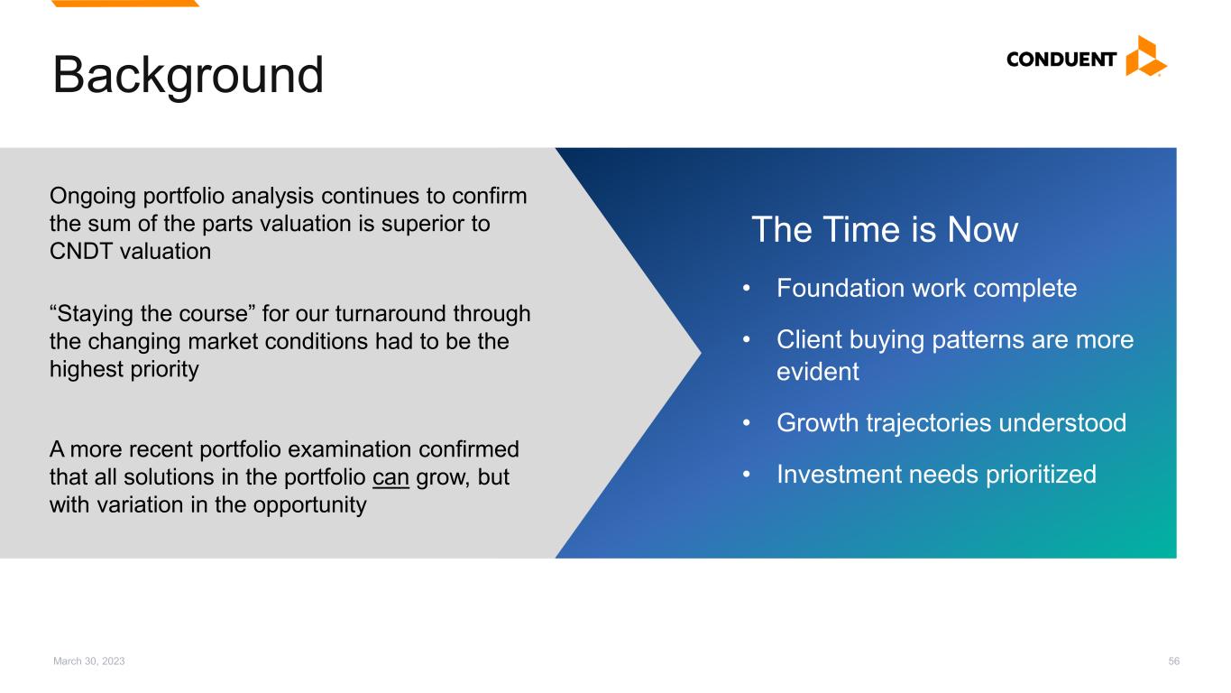 56 Background • Foundation work complete • Client buying patterns are more evident • Growth trajectories understood • Investment needs prioritized Ongoing portfolio analysis continues to confirm the sum of the parts valuation is superior to CNDT valuation “Staying the course” for our turnaround through the changing market conditions had to be the highest priority A more recent portfolio examination confirmed that all solutions in the portfolio can grow, but with variation in the opportunity The Time is Now March 30, 2023