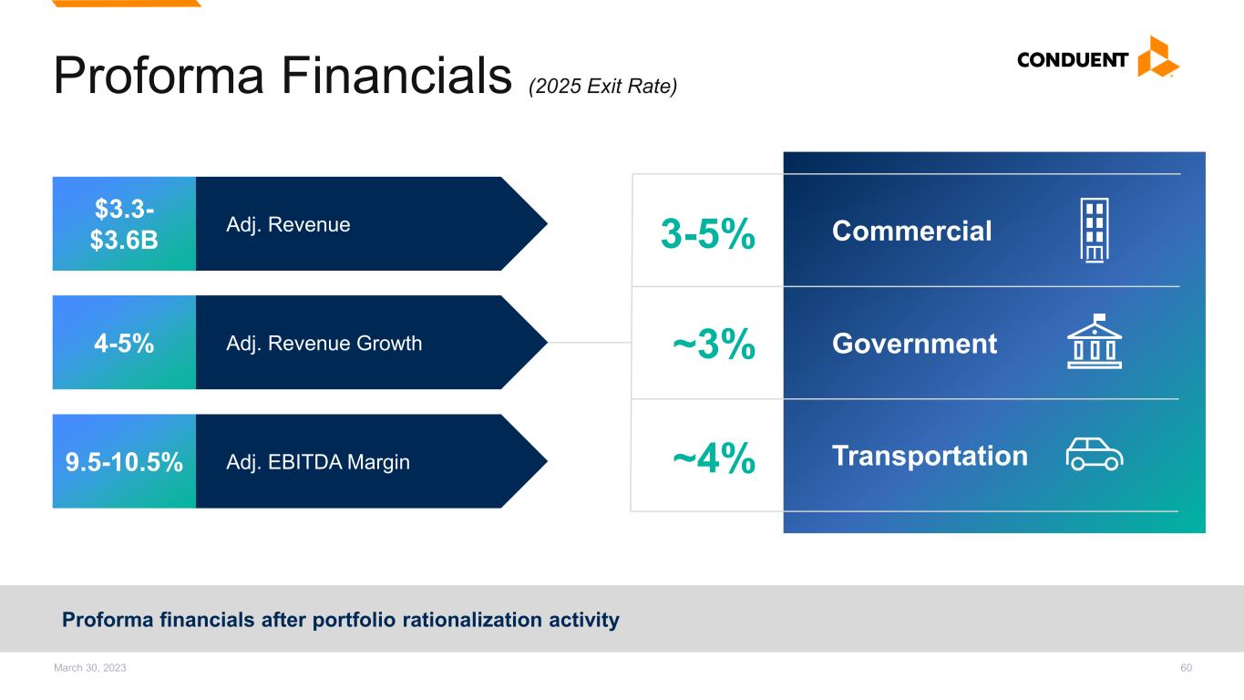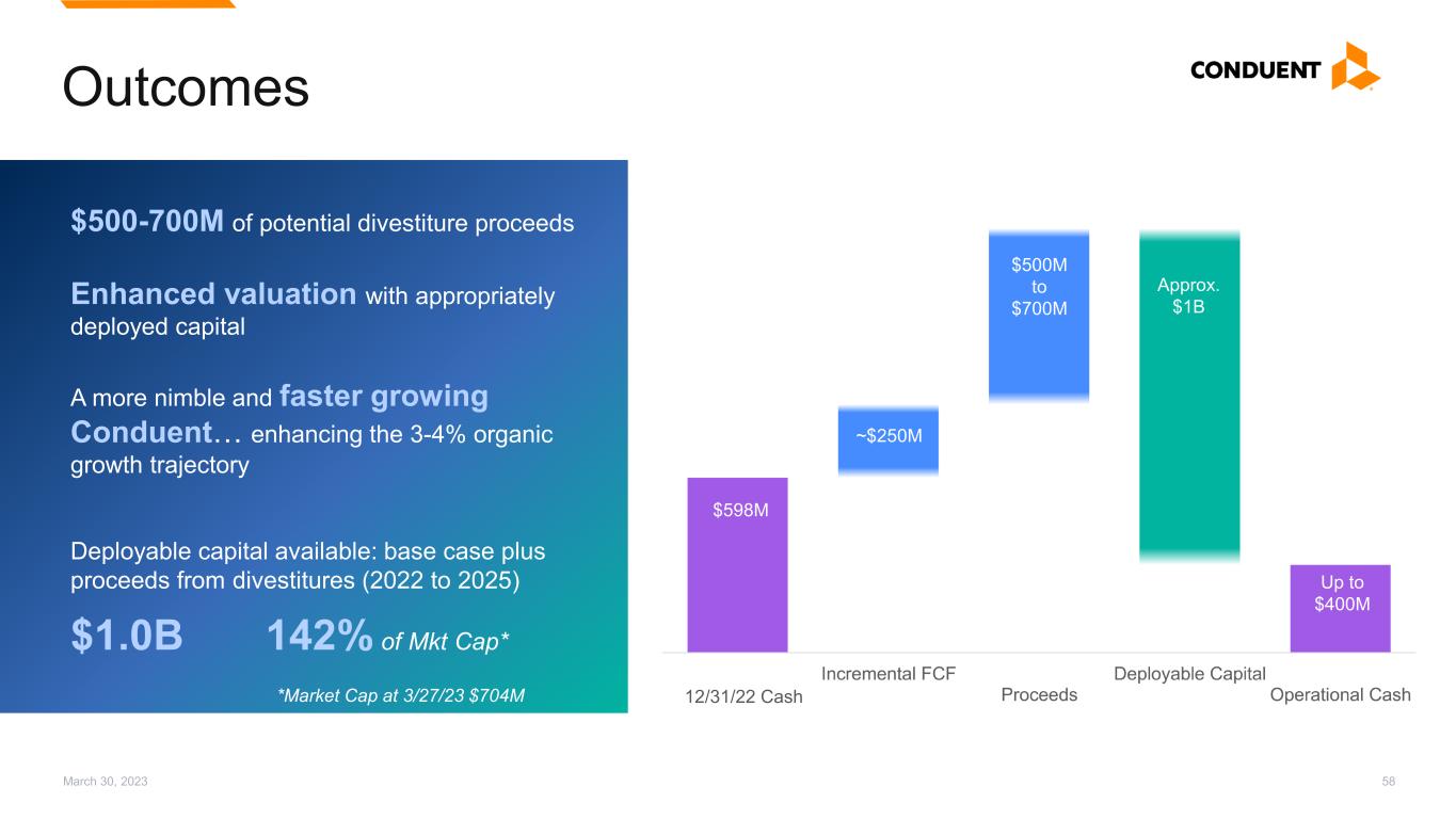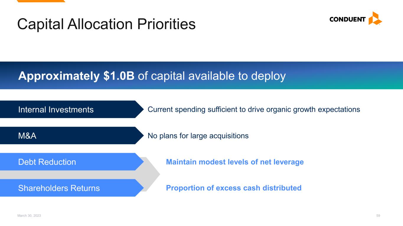 12/31/22 Cash 58 Outcomes $598M $680M $250M $598M ~$250M $500M to $700M Approx. $1B Up to $400M Deployable capital available: base case plus proceeds from divestitures (2022 to 2025) $1.0B 142% of Mkt Cap* *Market Cap at 3/27/23 $704M $500-700M of potential divestiture proceeds Enhanced valuation with appropriately deployed capital A more nimble and faster growing Conduent… enhancing the 3-4% organic growth trajectory March 30, 2023