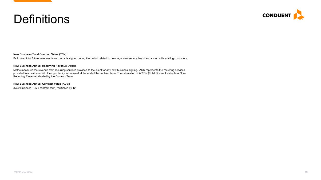 68 New Business Total Contract Value (TCV): Estimated total future revenues from contracts signed during the period related to new logo, new service line or expansion with existing customers. New Business Annual Recurring Revenue (ARR): Metric measures the revenue from recurring services provided to the client for any new business signing. ARR represents the recurring services provided to a customer with the opportunity for renewal at the end of the contract term. The calculation of ARR is (Total Contract Value less Non- Recurring Revenue) divided by the Contract Term. New Business Annual Contract Value (ACV): (New Business TCV / contract term) multiplied by 12. Definitions March 30, 2023