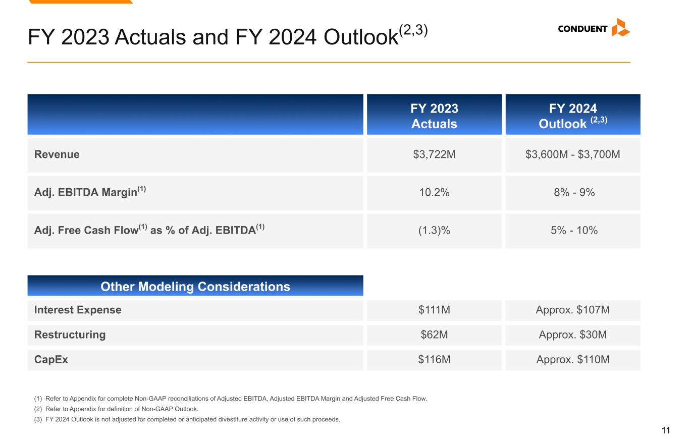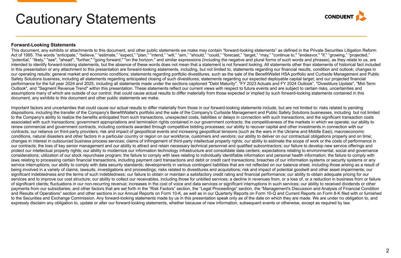 2 Forward-Looking Statements This document, any exhibits or attachments to this document, and other public statements we make may contain “forward-looking statements” as defined in the Private Securities Litigation Reform Act of 1995. The words “anticipate,” “believe,” “estimate,” “expect,” "plan," “intend,” “will,” “aim,” “should,” “could,” “forecast,” “target,” “may,” "continue to," "endeavor," "if,” “growing,” “projected,” “potential,” “likely,” "see", "ahead", "further," "going forward," "on the horizon," and similar expressions (including the negative and plural forms of such words and phrases), as they relate to us, are intended to identify forward-looking statements, but the absence of these words does not mean that a statement is not forward looking. All statements other than statements of historical fact included in this presentation or any attachment to this presentation are forward-looking statements, including, but not limited to, statements regarding our financial results, condition and outlook; changes in our operating results; general market and economic conditions; statements regarding portfolio divestitures, such as the sale of the BenefitWallet HSA portfolio and Curbside Management and Public Safety Solutions business, including all statements regarding anticipated closing of such divestitures; statements regarding our expected deployable capital target; and our projected financial performance for the full year 2024 and 2025, including all statements made under the sections captioned "Debt Maturity", “FY 2023 Actuals and FY 2024 Outlook”, "Divestiture Update", "Mid-Term Outlook", and "Segment Revenue Trend" within this presentation. These statements reflect our current views with respect to future events and are subject to certain risks, uncertainties and assumptions many of which are outside of our control, that could cause actual results to differ materially from those expected or implied by such forward-looking statements contained in this document, any exhibits to this document and other public statements we make. Important factors and uncertainties that could cause our actual results to differ materially from those in our forward-looking statements include, but are not limited to: risks related to pending dispositions, including the transfer of the Company's BenefitWallet's portfolio and the sale of the Company's Curbside Management and Public Safety Solutions businesses, including but not limited to the Company's ability to realize the benefits anticipated from such transactions, unexpected costs, liabilities or delays in connection with such transactions, and the significant transaction costs associated with such transactions; government appropriations and termination rights contained in our government contracts; the competitiveness of the markets in which we operate; our ability to renew commercial and government contracts, including contracts awarded through competitive bidding processes; our ability to recover capital and other investments in connection with our contracts; our reliance on third-party providers; risk and impact of geopolitical events and increasing geopolitical tensions (such as the wars in the Ukraine and Middle East), macroeconomic conditions, natural disasters and other factors in a particular country or region on our workforce, customers and vendors; our ability to deliver on our contractual obligations properly and on time; changes in interest in outsourced business process services; claims of infringement of third-party intellectual property rights; our ability to estimate the scope of work or the costs of performance in our contracts; the loss of key senior management and our ability to attract and retain necessary technical personnel and qualified subcontractors; our failure to develop new service offerings and protect our intellectual property rights; our ability to modernize our information technology infrastructure and consolidate data centers; expectations relating to environmental, social and governance considerations; utilization of our stock repurchase program; the failure to comply with laws relating to individually identifiable information and personal health information; the failure to comply with laws relating to processing certain financial transactions, including payment card transactions and debit or credit card transactions; breaches of our information systems or security systems or any service interruptions; our ability to comply with data security standards; developments in various contingent liabilities that are not reflected on our balance sheet, including those arising as a result of being involved in a variety of claims, lawsuits, investigations and proceedings; risks related to divestitures and acquisitions; risk and impact of potential goodwill and other asset impairments; our significant indebtedness and the terms of such indebtedness; our failure to obtain or maintain a satisfactory credit rating and financial performance; our ability to obtain adequate pricing for our services and to improve our cost structure; our ability to collect our receivables, including those for unbilled services; a decline in revenues from, or a loss of, or a reduction in business from or failure of significant clients; fluctuations in our non-recurring revenue; increases in the cost of voice and data services or significant interruptions in such services; our ability to received dividends or other payments from our subsidiaries; and other factors that are set forth in the “Risk Factors” section, the “Legal Proceedings” section, the “Management's Discussion and Analysis of Financial Condition and Results of Operations” section and other sections in our Annual Reports on Form 10-K, as well as in our Quarterly Reports on Form 10-Q and Current Reports on Form 8-K filed with or furnished to the Securities and Exchange Commission. Any forward-looking state