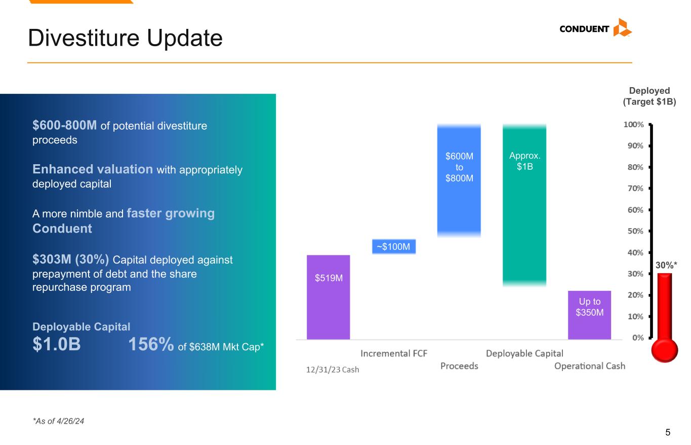 4 Q1 2024 Highlights (1) Refer to Appendix for complete Non-GAAP reconciliations of Adjusted EBITDA and Adjusted EBITDA Margin. (2) Full definition in the Appendix. (3) Trailing Twelve Months. Q1 Results / Metrics Highlights • Revenue: $921M • Adj. EBITDA(1): $69M • Adj. EBITDA Margin(1): 7.5% • New business signings ACV(2): $99M • Net ARR Activity Impact (TTM)(2,3): $17M • Q1 Puts and Takes • Strong revenue quarter, exceeding expectations and flat YOY • Adj. EBITDA/EBITDA margin in line with Q1 expectations • Sales lagged expectations in Q1, primarily due to contract timing… expect improvement in Q2 • Segment ‘lumpiness’ characterized by improvement in Transportation and some softness in Government • Divestiture Activities Continue in Full Swing • Approximately $500M of after-tax proceeds from announced deals • 30% of our $1 billion deployable capital already deployed • Initial proceeds used for debt repayment