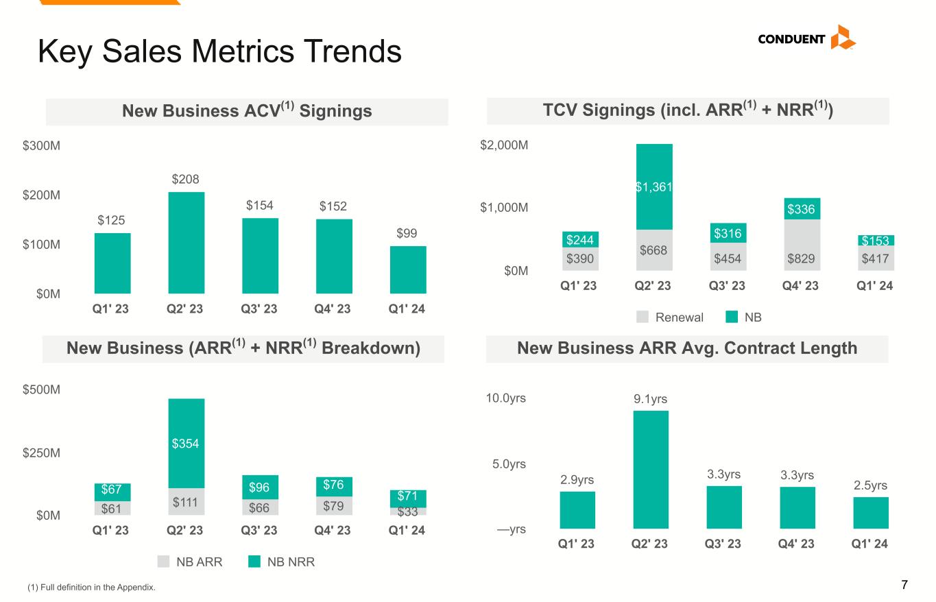 6 Key Sales Metrics New Business ACV(1) Q1 New Business ACV(1) by Segment (1) Full definition in the Appendix. (2) Trailing Twelve Months. $244 $153 Q1'23 Q1'24 $0M $100M $200M $300M New Business TCV(1) $61 $33 Q1'23 Q1'24 $0M $25M $50M $75M $35M $32M $32M Commercial Government Transportation Net ARR Activity (TTM)(1,2) $108 $137 $103 $62 $17 Q1' 23 Q2' 23 Q3' 23 Q4' 23 Q1' 24 $0M $50M $100M $150M $125 $99 Q1'23 Q1'24 $0M $50M $100M $150M New Business ARR(1)