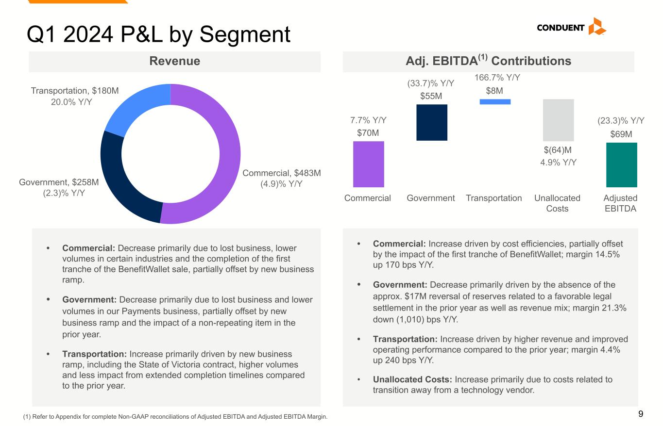 8 Q1 2024 P&L Metrics $922M $921M Q1 2023 Q1 2024 $0M $500M $1,000M (0.1)% Y/Y (0.3)% in CC Revenue $90M / 9.8% $69M / 7.5% Q1 2023 Q1 2024 $0M $40M $80M $120M Adj. EBITDA(1) / Adj. EBITDA Margin(1) (23.3)% Y/Y • Revenue: Substantially unchanged. New business ramp and stronger volumes in our Transportation segment, offset by lost business and lower volumes in Commercial and Government segments, as well as the impact of completing the first tranche of the BenefitWallet transfer. • Adj. EBITDA and Adj. EBITDA Margin(1): Decline primarily driven by the absence of a reversal of reserves related to a favorable legal settlement in our Government segment in the prior year. (4.0)% (1.4)% (4.6)% (3.3)% (0.1)% Q1' 23 Q2' 23 Q3' 23 Q4' 23 Q1' 24 Revenue Trend (Y/Y Compare) (1) Refer to Appendix for complete Non-GAAP reconciliations of Adjusted EBITDA and Adjusted EBITDA Margin.