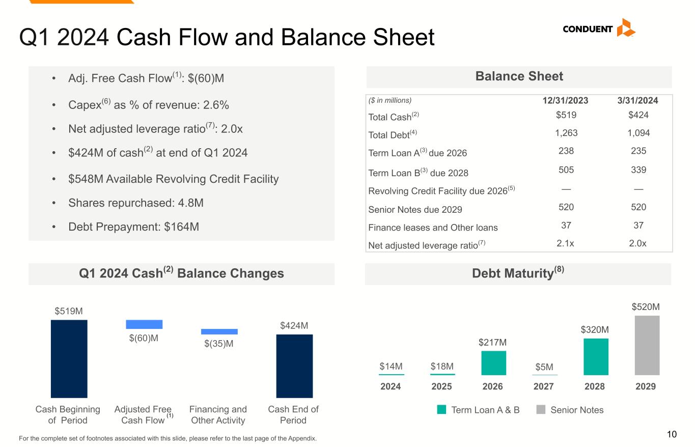 9 $70M $55M $8M $(64)M $69M Commercial Government Transportation Unallocated Costs Adjusted EBITDA Q1 2024 P&L by Segment (1) Refer to Appendix for complete Non-GAAP reconciliations of Adjusted EBITDA and Adjusted EBITDA Margin. Commercial, $483M Government, $258M Transportation, $180M 20.0% Y/Y (2.3)% Y/Y (4.9)% Y/Y 166.7% Y/Y (33.7)% Y/Y 7.7% Y/Y Revenue Adj. EBITDA(1) Contributions (23.3)% Y/Y 4.9% Y/Y • Commercial: Decrease primarily due to lost business, lower volumes in certain industries and the completion of the first tranche of the BenefitWallet sale, partially offset by new business ramp. • Government: Decrease primarily due to lost business and lower volumes in our Payments business, partially offset by new business ramp and the impact of a non-repeating item in the prior year. • Transportation: Increase primarily driven by new business ramp, including the State of Victoria contract, higher volumes and less impact from extended completion timelines compared to the prior year. • Commercial: Increase driven by cost efficiencies, partially offset by the impact of the first tranche of BenefitWallet; margin 14.5% up 170 bps Y/Y. • Government: Decrease primarily driven by the absence of the approx. $17M reversal of reserves related to a favorable legal settlement in the prior year as well as revenue mix; margin 21.3% down (1,010) bps Y/Y. • Transportation: Increase driven by higher revenue and improved operating performance compared to the prior year; margin 4.4% up 240 bps Y/Y. • Unallocated Costs: Increase primarily due to costs related to transition away from a technology vendor.