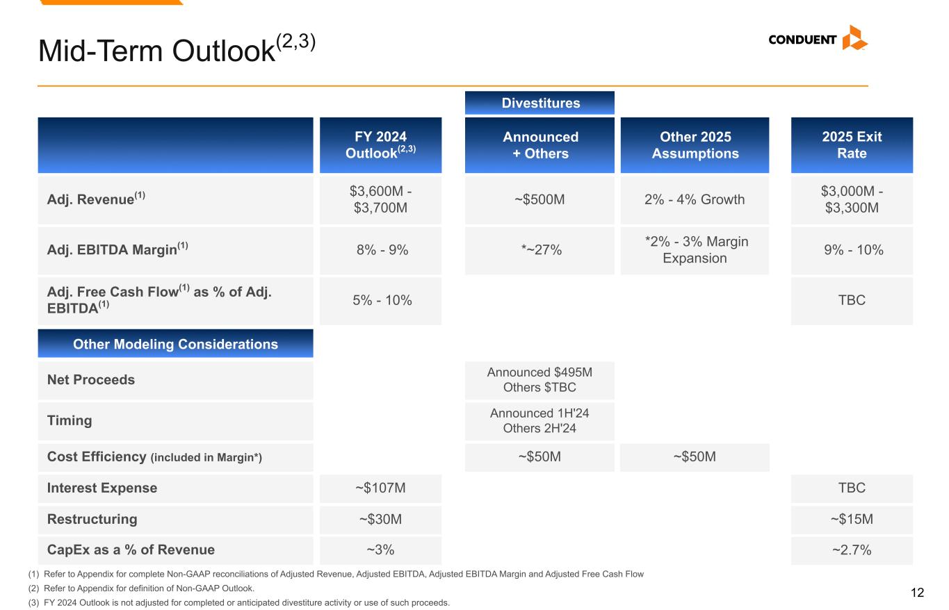 11 FY 2023 Actuals and FY 2024 Outlook(2,3) (1) Refer to Appendix for complete Non-GAAP reconciliations of Adjusted EBITDA, Adjusted EBITDA Margin and Adjusted Free Cash Flow. (2) Refer to Appendix for definition of Non-GAAP Outlook. (3) FY 2024 Outlook is not adjusted for completed or anticipated divestiture activity or use of such proceeds. FY 2023 Actuals FY 2024 Outlook (2,3) $3,722MRevenue Other Modeling Considerations Adj. EBITDA Margin(1) Adj. Free Cash Flow(1) as % of Adj. EBITDA(1) $3,600M - $3,700M Interest Expense Restructuring CapEx 10.2% (1.3)% 8% - 9% 5% - 10% $111M Approx. $107M $62M $116M Approx. $30M Approx. $110M