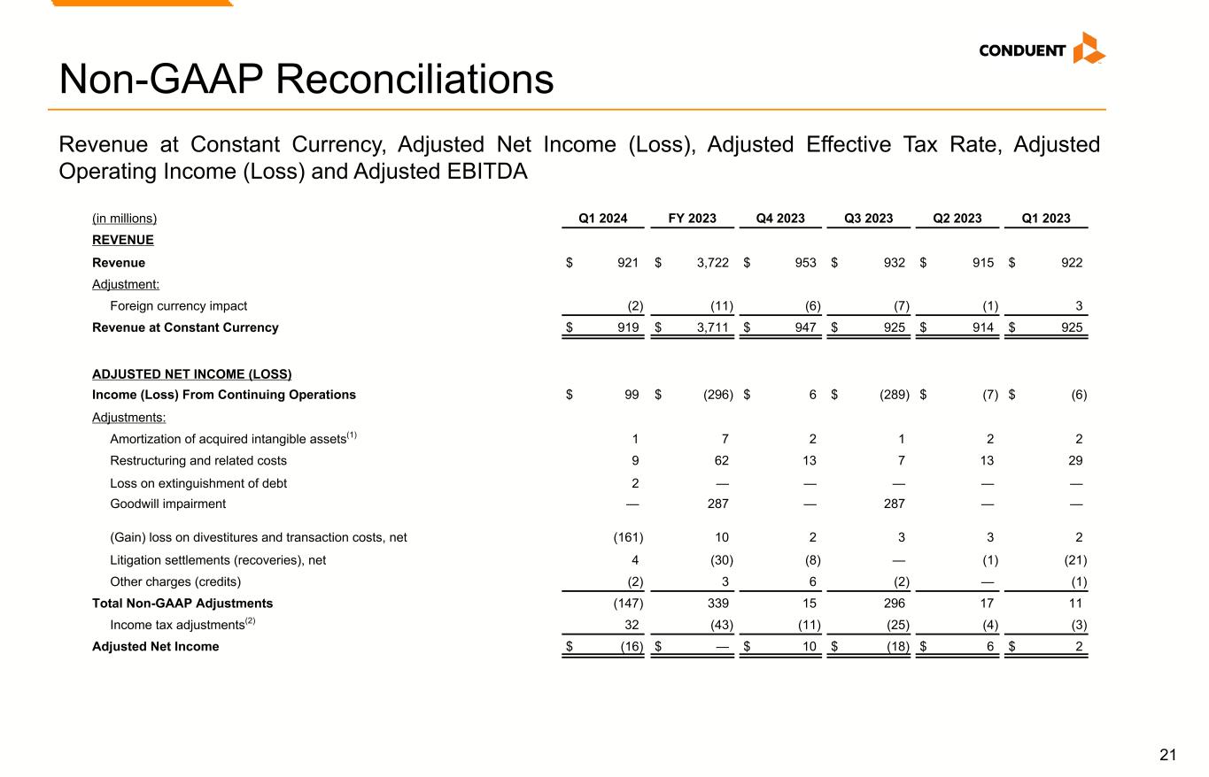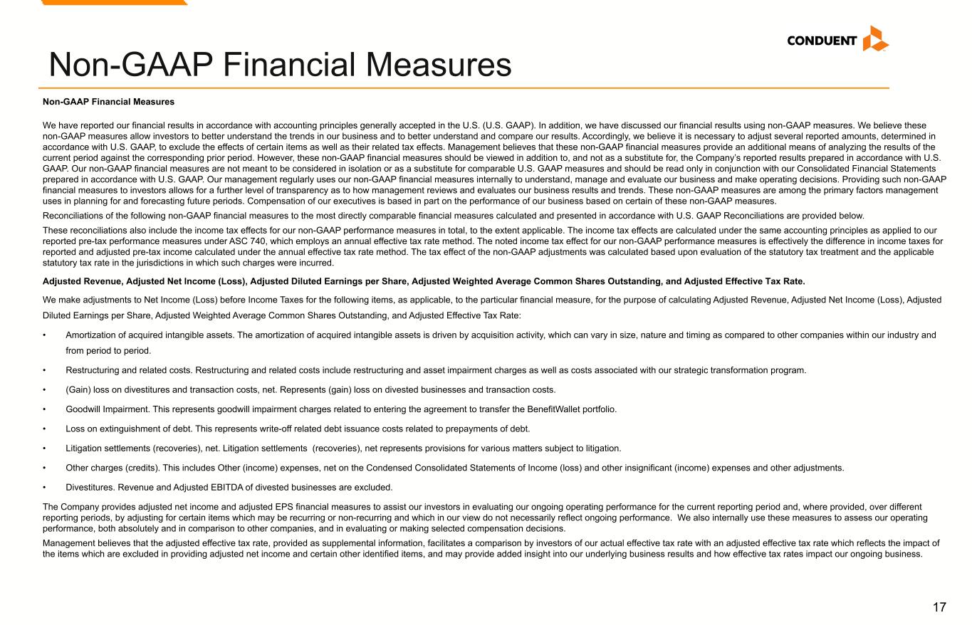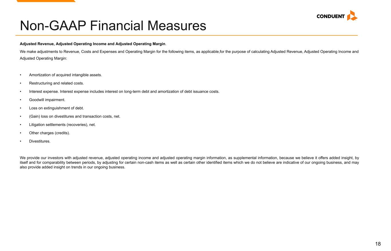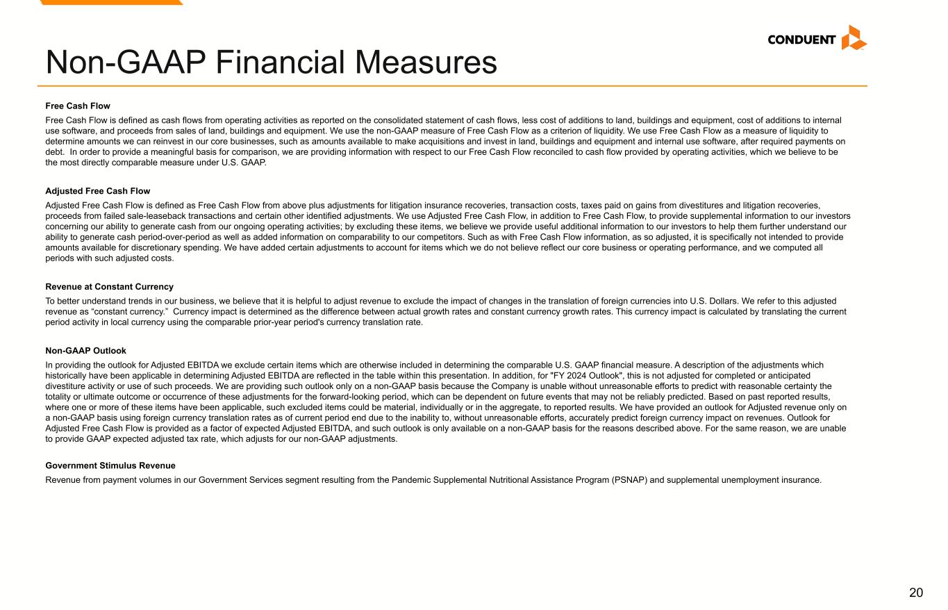 19 Adjusted EBITDA and EBITDA Margin We use Adjusted EBITDA and Adjusted EBITDA Margin as an additional way of assessing certain aspects of our operations that, when viewed with the U.S. GAAP results and the accompanying reconciliations to corresponding U.S. GAAP financial measures, provide a more complete understanding of our on-going business. Adjusted EBITDA represents income (loss) before interest, income taxes, depreciation and amortization and contract inducement amortization adjusted for the following items. Adjusted EBITDA Margin is Adjusted EBITDA divided by revenue or adjusted revenue, as applicable: • Restructuring and related costs. • Goodwill impairment. • Loss on extinguishment of debt. • (Gain) loss on divestitures and transaction costs, net. • Litigation settlements (recoveries), net. • Other charges (credits). • Divestitures. Adjusted EBITDA is not intended to represent cash flows from operations, operating income (loss) or net income (loss) as defined by U.S. GAAP as indicators of operating performance. Management cautions that amounts presented in accordance with Conduent’s definition of Adjusted EBITDA and Adjusted EBITDA Margin may not be comparable to similar measures disclosed by other companies because not all companies calculate Adjusted EBITDA and Adjusted EBITDA Margin in the same manner. Non-GAAP Financial Measures