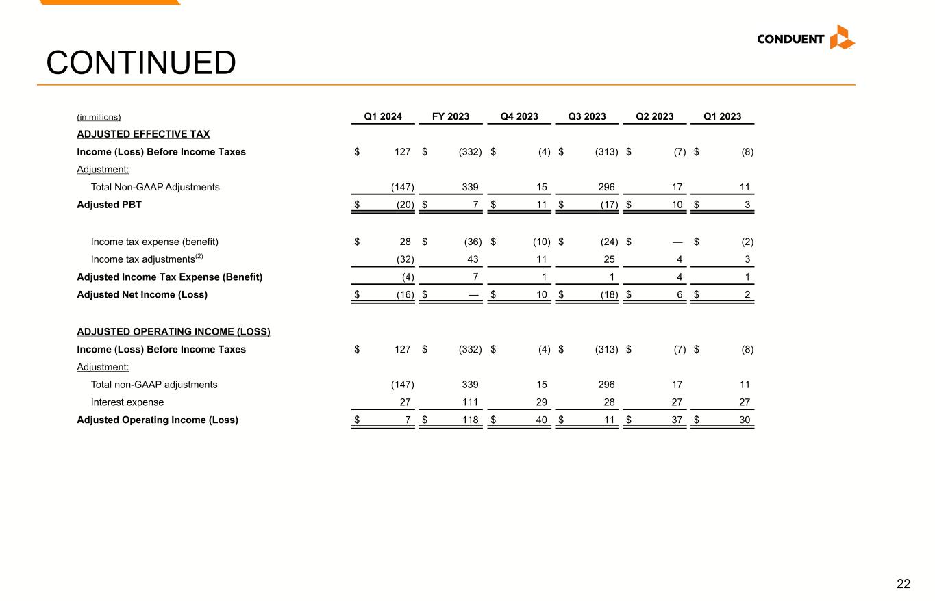 21 Non-GAAP Reconciliations (in millions) Q1 2024 FY 2023 Q4 2023 Q3 2023 Q2 2023 Q1 2023 REVENUE Revenue $ 921 $ 3,722 $ 953 $ 932 $ 915 $ 922 Adjustment: Foreign currency impact (2) (11) (6) (7) (1) 3 Revenue at Constant Currency $ 919 $ 3,711 $ 947 $ 925 $ 914 $ 925 ADJUSTED NET INCOME (LOSS) Income (Loss) From Continuing Operations $ 99 $ (296) $ 6 $ (289) $ (7) $ (6) Adjustments: Amortization of acquired intangible assets(1) 1 7 2 1 2 2 Restructuring and related costs 9 62 13 7 13 29 Loss on extinguishment of debt 2 — — — — — Goodwill impairment — 287 — 287 — — (Gain) loss on divestitures and transaction costs, net (161) 10 2 3 3 2 Litigation settlements (recoveries), net 4 (30) (8) — (1) (21) Other charges (credits) (2) 3 6 (2) — (1) Total Non-GAAP Adjustments (147) 339 15 296 17 11 Income tax adjustments(2) 32 (43) (11) (25) (4) (3) Adjusted Net Income $ (16) $ — $ 10 $ (18) $ 6 $ 2 Revenue at Constant Currency, Adjusted Net Income (Loss), Adjusted Effective Tax Rate, Adjusted Operating Income (Loss) and Adjusted EBITDA