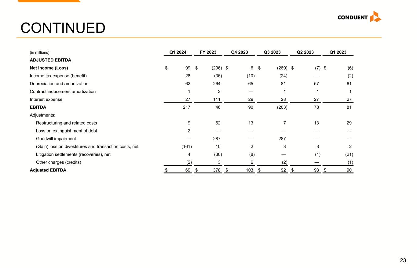 23 (in millions) Q1 2024 FY 2023 Q4 2023 Q3 2023 Q2 2023 Q1 2023 ADJUSTED EBITDA Net Income (Loss) $ 99 $ (296) $ 6 $ (289) $ (7) $ (6) Income tax expense (benefit) 28 (36) (10) (24) — (2) Depreciation and amortization 62 264 65 81 57 61 Contract inducement amortization 1 3 — 1 1 1 Interest expense 27 111 29 28 27 27 EBITDA 217 46 90 (203) 78 81 Adjustments: Restructuring and related costs 9 62 13 7 13 29 Loss on extinguishment of debt 2 — — — — — Goodwill impairment — 287 — 287 — — (Gain) loss on divestitures and transaction costs, net (161) 10 2 3 3 2 Litigation settlements (recoveries), net 4 (30) (8) — (1) (21) Other charges (credits) (2) 3 6 (2) — (1) Adjusted EBITDA $ 69 $ 378 $ 103 $ 92 $ 93 $ 90 CONTINUED