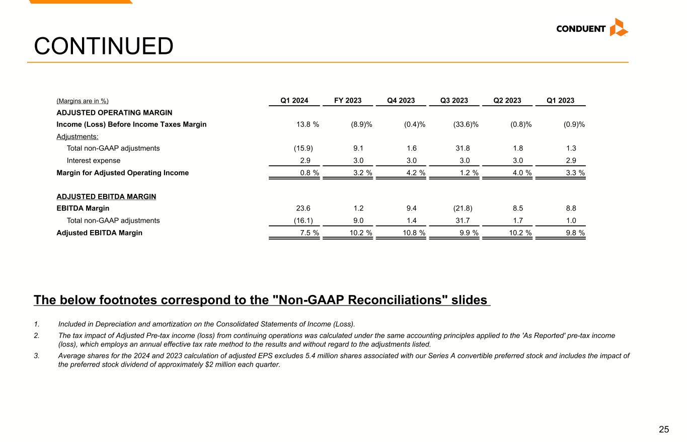 24 CONTINUED (Amounts are in whole dollars, shares are in thousands and margins are in %) Q1 2024 FY 2023 Q4 2023 Q3 2023 Q2 2023 Q1 2023 ADJUSTED DILUTED EPS(3) Weighted Average Common Shares Outstanding 209,160 216,779 213,625 217,348 218,394 218,410 Adjustments: Restricted stock and performance units / shares — — 3,037 — 928 — Adjusted Weighted Average Common Shares Outstanding 209,160 216,779 216,662 217,348 219,322 218,410 Diluted EPS from Continuing Operations $ 0.46 $ (1.41) $ 0.02 $ (1.34) $ (0.04) $ (0.04) Adjustments: Total non-GAAP adjustments (0.70) 1.57 0.06 1.37 0.07 0.05 Income tax adjustments(2) 0.15 (0.20) (0.05) (0.12) (0.02) (0.01) Adjusted Diluted EPS $ (0.09) $ (0.04) $ 0.03 $ (0.09) $ 0.01 $ — ADJUSTED EFFECTIVE TAX RATE Effective tax rate 21.9 % 10.7 % 272.1 % 7.8 % (3.3) % 20.8 % Adjustments: Total non-GAAP adjustments 0.3 96.6 (259.0) (13.9) 45.5 14.2 Adjusted Effective Tax Rate(2) 22.2 % 107.3 % 13.1 % (6.1) % 42.2 % 35.0 % Adjusted Weighted Average Shares Outstanding, Adjusted Diluted EPS, Adjusted Effective Tax Rate, Adjusted Operating Margin, and Adjusted EBITDA Margin