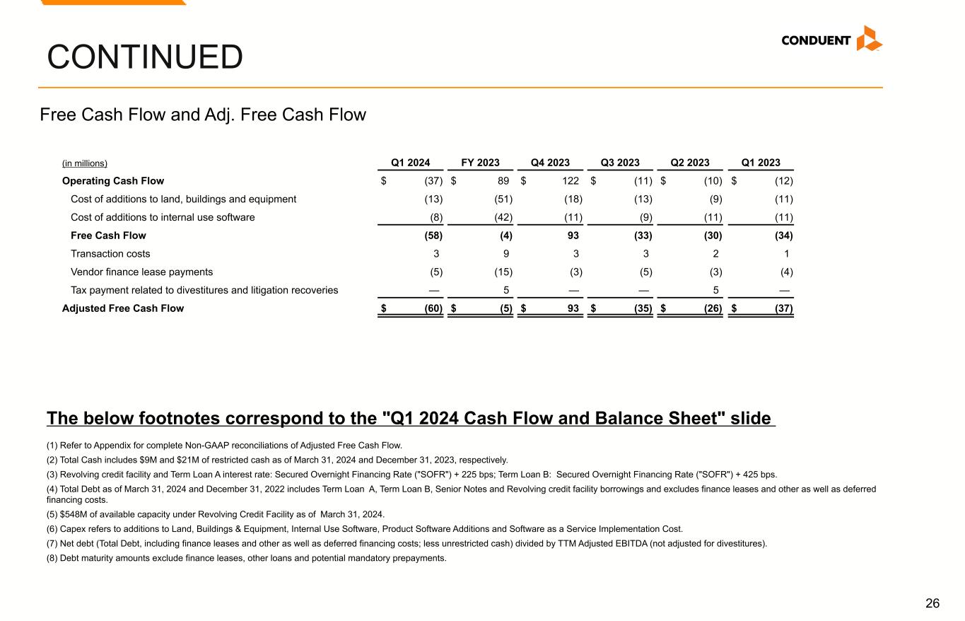 25 (Margins are in %) Q1 2024 FY 2023 Q4 2023 Q3 2023 Q2 2023 Q1 2023 ADJUSTED OPERATING MARGIN Income (Loss) Before Income Taxes Margin 13.8 % (8.9) % (0.4) % (33.6) % (0.8) % (0.9) % Adjustments: Total non-GAAP adjustments (15.9) 9.1 1.6 31.8 1.8 1.3 Interest expense 2.9 3.0 3.0 3.0 3.0 2.9 Margin for Adjusted Operating Income 0.8 % 3.2 % 4.2 % 1.2 % 4.0 % 3.3 % ADJUSTED EBITDA MARGIN EBITDA Margin 23.6 1.2 9.4 (21.8) 8.5 8.8 Total non-GAAP adjustments (16.1) 9.0 1.4 31.7 1.7 1.0 Adjusted EBITDA Margin 7.5 % 10.2 % 10.8 % 9.9 % 10.2 % 9.8 % 1. Included in Depreciation and amortization on the Consolidated Statements of Income (Loss). 2. The tax impact of Adjusted Pre-tax income (loss) from continuing operations was calculated under the same accounting principles applied to the 'As Reported' pre-tax income (loss), which employs an annual effective tax rate method to the results and without regard to the adjustments listed. 3. Average shares for the 2024 and 2023 calculation of adjusted EPS excludes 5.4 million shares associated with our Series A convertible preferred stock and includes the impact of the preferred stock dividend of approximately $2 million each quarter. CONTINUED The below footnotes correspond to the "Non-GAAP Reconciliations" slides