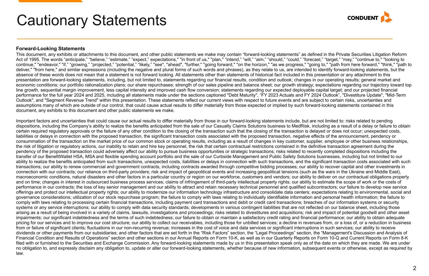 2 Forward-Looking Statements This document, any exhibits or attachments to this document, and other public statements we make may contain “forward-looking statements” as defined in the Private Securities Litigation Reform Act of 1995. The words “anticipate,” “believe,” “estimate,” “expect,” expectations," "in front of us," "plan," “intend,” “will,” “aim,” “should,” “could,” “forecast,” “target,” “may,” "continue to," "looking to continue," "endeavor," "if,” “growing,” “projected,” “potential,” “likely,” "see", "ahead", "further," "going forward," "on the horizon," "as we progress," "going to," "path from here forward," "think," "path to deliver," "from here," and similar expressions (including the negative and plural forms of such words and phrases), as they relate to us, are intended to identify forward-looking statements, but the absence of these words does not mean that a statement is not forward looking. All statements other than statements of historical fact included in this presentation or any attachment to this presentation are forward-looking statements, including, but not limited to, statements regarding our financial results, condition and outlook; changes in our operating results; general market and economic conditions; our portfolio rationalization plans; our share repurchases; strength of our sales pipeline and balance sheet; our growth strategy; expectations regarding our trajectory toward top line growth, sequential margin improvement, less capital intensity and improved cash flow conversion; statements regarding our expected deployable capital target; and our projected financial performance for the full year 2024 and 2025, including all statements made under the sections captioned "Debt Maturity", “FY 2023 Actuals and FY 2024 Outlook”, "Divestiture Update", "Mid-Term Outlook", and "Segment Revenue Trend" within this presentation. These statements reflect our current views with respect to future events and are subject to certain risks, uncertainties and assumptions many of which are outside of our control, that could cause actual results to differ materially from those expected or implied by such forward-looking statements contained in this document, any exhibits to this document and other public statements we make. Important factors and uncertainties that could cause our actual results to differ materially from those in our forward-looking statements include, but are not limited to: risks related to pending dispositions, including the Company’s ability to realize the benefits anticipated from the sale of our Casualty Claims Solutions business to MedRisk, including as a result of a delay or failure to obtain certain required regulatory approvals or the failure of any other condition to the closing of the transaction such that the closing of the transaction is delayed or does not occur; unexpected costs, liabilities or delays in connection with the proposed transaction, the significant transaction costs associated with the proposed transaction, negative effects of the announcement, pendency or consummation of the transaction on the market price of our common stock or operating results, including as a result of changes in key customer, supplier, employee or other business relationships, the risk of litigation or regulatory actions, our inability to retain and hire key personnel, the risk that certain contractual restrictions contained in the definitive transaction agreement during the pendency of the proposed transaction could adversely affect our ability to pursue business opportunities or strategic transactions; risks related to recently completed dispositions including the transfer of our BenefitWallet HSA, MSA and flexible spending account portfolio and the sale of our Curbside Management and Public Safety Solutions businesses, including but not limited to our ability to realize the benefits anticipated from such transactions, unexpected costs, liabilities or delays in connection with such transactions, and the significant transaction costs associated with such transactions; our ability to renew commercial and government contracts, including contracts awarded through competitive bidding processes; our ability to recover capital and other investments in connection with our contracts; our reliance on third-party providers; risk and impact of geopolitical events and increasing geopolitical tensions (such as the wars in the Ukraine and Middle East), macroeconomic conditions, natural disasters and other factors in a particular country or region on our workforce, customers and vendors; our ability to deliver on our contractual obligations properly and on time; changes in interest in outsourced business process services; claims of infringement of third-party intellectual property rights; our ability to estimate the scope of work or the costs of performance in our contracts; the loss of key senior management and our ability to attract and retain necessary technical personnel and qualified subcontractors; our failure to develop new service offerings and protect our intellectual property rights; our ability to modernize our information technology infrastructure and consolidate data centers; expectations relating to environmental, social and governance considerations; utilization of our stock repurchase program; the failure to comply with laws relating to individually identifiable information and personal health information; the failure to comply with laws relating to processing certain financial transactions, including payment card transactions and debit or credit card transactions; breaches of our information systems or security systems or any service interruptions; our ability to comply with data security standards; developments in various contingent liabilities that are not reflected on our balance sheet, including those arising as a result of being involved in a variety of claims, lawsuits, investigati