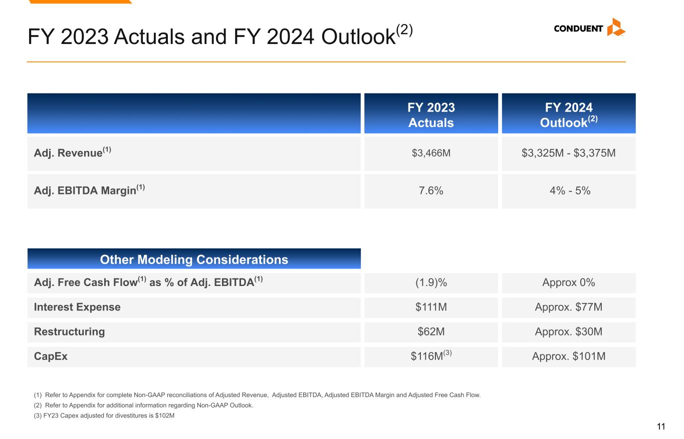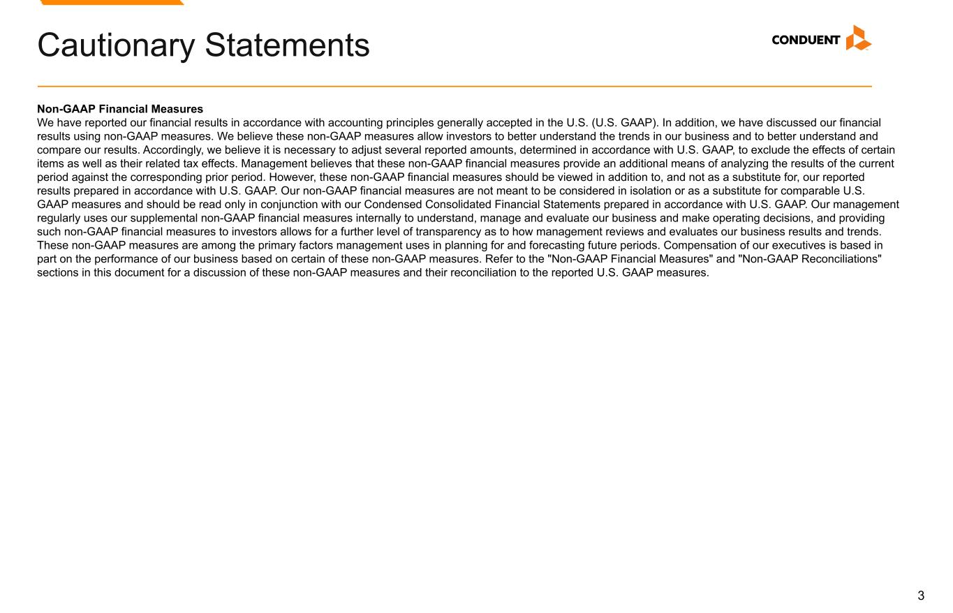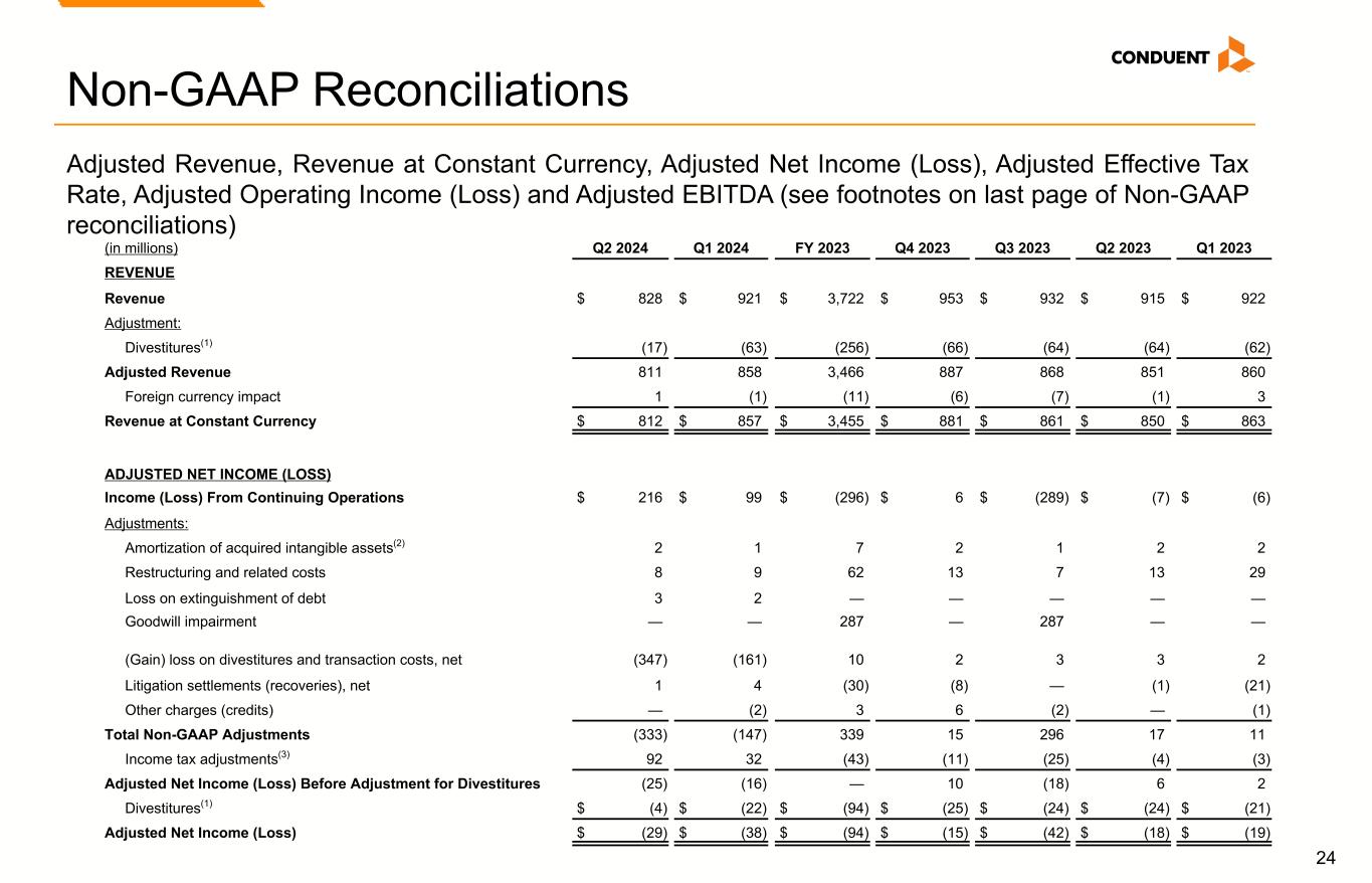 22 Adjusted EBITDA and EBITDA Margin We use Adjusted EBITDA and Adjusted EBITDA Margin as an additional way of assessing certain aspects of our operations that, when viewed with the U.S. GAAP results and the accompanying reconciliations to corresponding U.S. GAAP financial measures, provide a more complete understanding of our on-going business. Adjusted EBITDA represents income (loss) before interest, income taxes, depreciation and amortization and contract inducement amortization adjusted for the following items. Adjusted EBITDA Margin is Adjusted EBITDA divided by revenue or adjusted revenue, as applicable: • Restructuring and related costs. • Goodwill impairment. • Loss on extinguishment of debt. • (Gain) loss on divestitures and transaction costs, net. • Litigation settlements (recoveries), net. • Other charges (credits). • Divestitures. Adjusted EBITDA is not intended to represent cash flows from operations, operating income (loss) or net income (loss) as defined by U.S. GAAP as indicators of operating performance. Management cautions that amounts presented in accordance with Conduent’s definition of Adjusted EBITDA and Adjusted EBITDA Margin may not be comparable to similar measures disclosed by other companies because not all companies calculate Adjusted EBITDA and Adjusted EBITDA Margin in the same manner. Non-GAAP Financial Measures