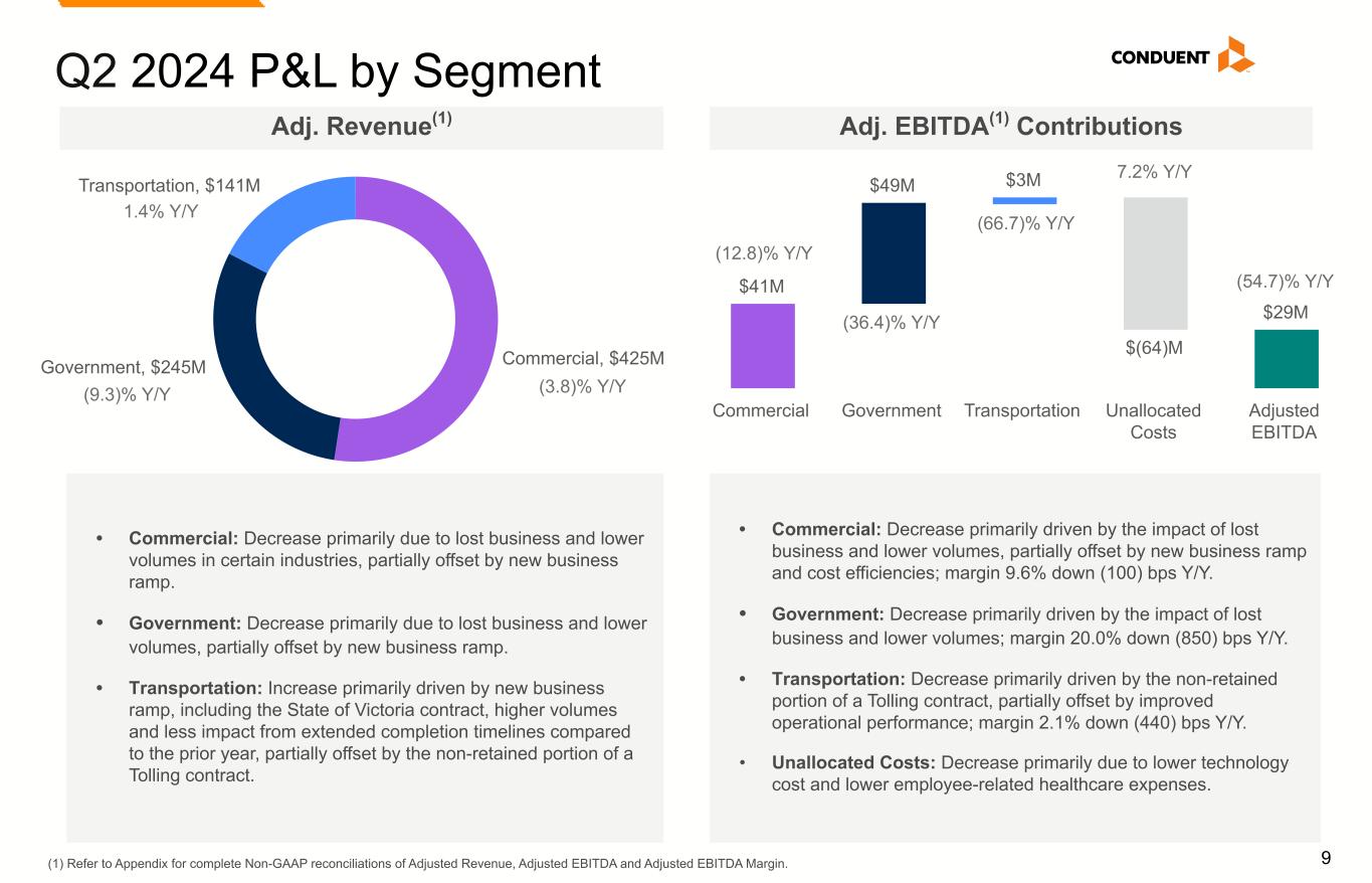 8 Q2 2024 P&L Metrics $851M $811M Q2 2023 Q2 2024 $0M $500M $1,000M (4.7)% Y/Y (4.6)% in CC Adj. Revenue(1) $64M / 7.5% $29M / 3.6% Q2 2023 Q2 2024 $0M $25M $50M $75M Adj. EBITDA(1) / Adj. EBITDA Margin(1) (54.7)% Y/Y • Adj. Revenue(1): Decline primary driven by lost business in the Commercial and Government segments as well as a reduction in scope of a large Transportation client, partially offset by new business ramp across all 3 segments. • Adj. EBITDA and Adj. EBITDA Margin(1): Decline driven by lost business in the Government segment, a non-retained portion of a Transportation client and the timing of stranded cost take out, partially offset by cost efficiencies and lower employee-related healthcare expenses. (3.0)% (5.8)% (4.3)% (0.2)% (4.7)% Q2' 23 Q3' 23 Q4' 23 Q1' 24 Q2' 24 Adj. Revenue(1) Trend (Y/Y Compare) (1) Refer to Appendix for complete Non-GAAP reconciliations of Adjusted Revenue, Adjusted EBITDA and Adjusted EBITDA Margin.