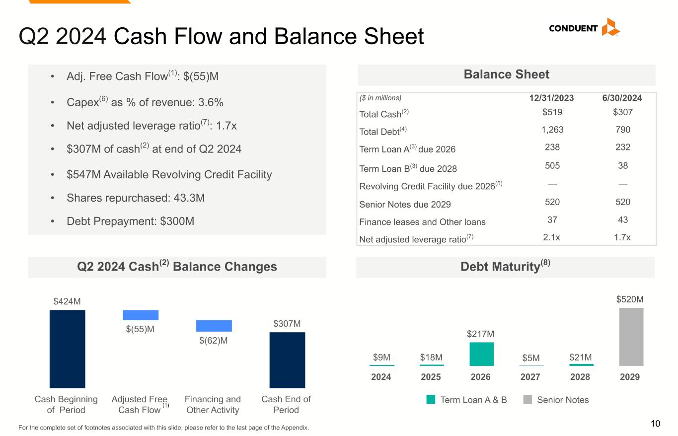 9 $41M $49M $3M $(64)M $29M Commercial Government Transportation Unallocated Costs Adjusted EBITDA Q2 2024 P&L by Segment (1) Refer to Appendix for complete Non-GAAP reconciliations of Adjusted Revenue, Adjusted EBITDA and Adjusted EBITDA Margin. Commercial, $425MGovernment, $245M Transportation, $141M 1.4% Y/Y (9.3)% Y/Y (3.8)% Y/Y (66.7)% Y/Y (36.4)% Y/Y (12.8)% Y/Y Adj. Revenue(1) Adj. EBITDA(1) Contributions (54.7)% Y/Y 7.2% Y/Y • Commercial: Decrease primarily due to lost business and lower volumes in certain industries, partially offset by new business ramp. • Government: Decrease primarily due to lost business and lower volumes, partially offset by new business ramp. • Transportation: Increase primarily driven by new business ramp, including the State of Victoria contract, higher volumes and less impact from extended completion timelines compared to the prior year, partially offset by the non-retained portion of a Tolling contract. • Commercial: Decrease primarily driven by the impact of lost business and lower volumes, partially offset by new business ramp and cost efficiencies; margin 9.6% down (100) bps Y/Y. • Government: Decrease primarily driven by the impact of lost business and lower volumes; margin 20.0% down (850) bps Y/Y. • Transportation: Decrease primarily driven by the non-retained portion of a Tolling contract, partially offset by improved operational performance; margin 2.1% down (440) bps Y/Y. • Unallocated Costs: Decrease primarily due to lower technology cost and lower employee-related healthcare expenses.