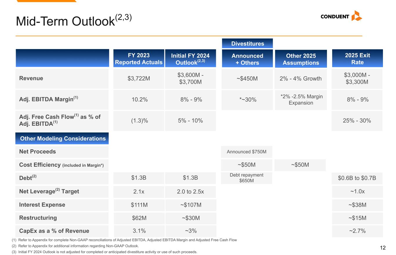 11 FY 2023 Actuals and FY 2024 Outlook(2) (1) Refer to Appendix for complete Non-GAAP reconciliations of Adjusted Revenue, Adjusted EBITDA, Adjusted EBITDA Margin and Adjusted Free Cash Flow. (2) Refer to Appendix for additional information regarding Non-GAAP Outlook. (3) FY23 Capex adjusted for divestitures is $102M FY 2023 Actuals FY 2024 Outlook(2) $3,466MAdj. Revenue(1) Other Modeling Considerations Adj. EBITDA Margin(1) $3,325M - $3,375M Interest Expense Restructuring CapEx 7.6% 4% - 5% $111M Approx. $77M $62M $116M(3) Approx. $30M Approx. $101M Adj. Free Cash Flow(1) as % of Adj. EBITDA(1) (1.9)% Approx 0%