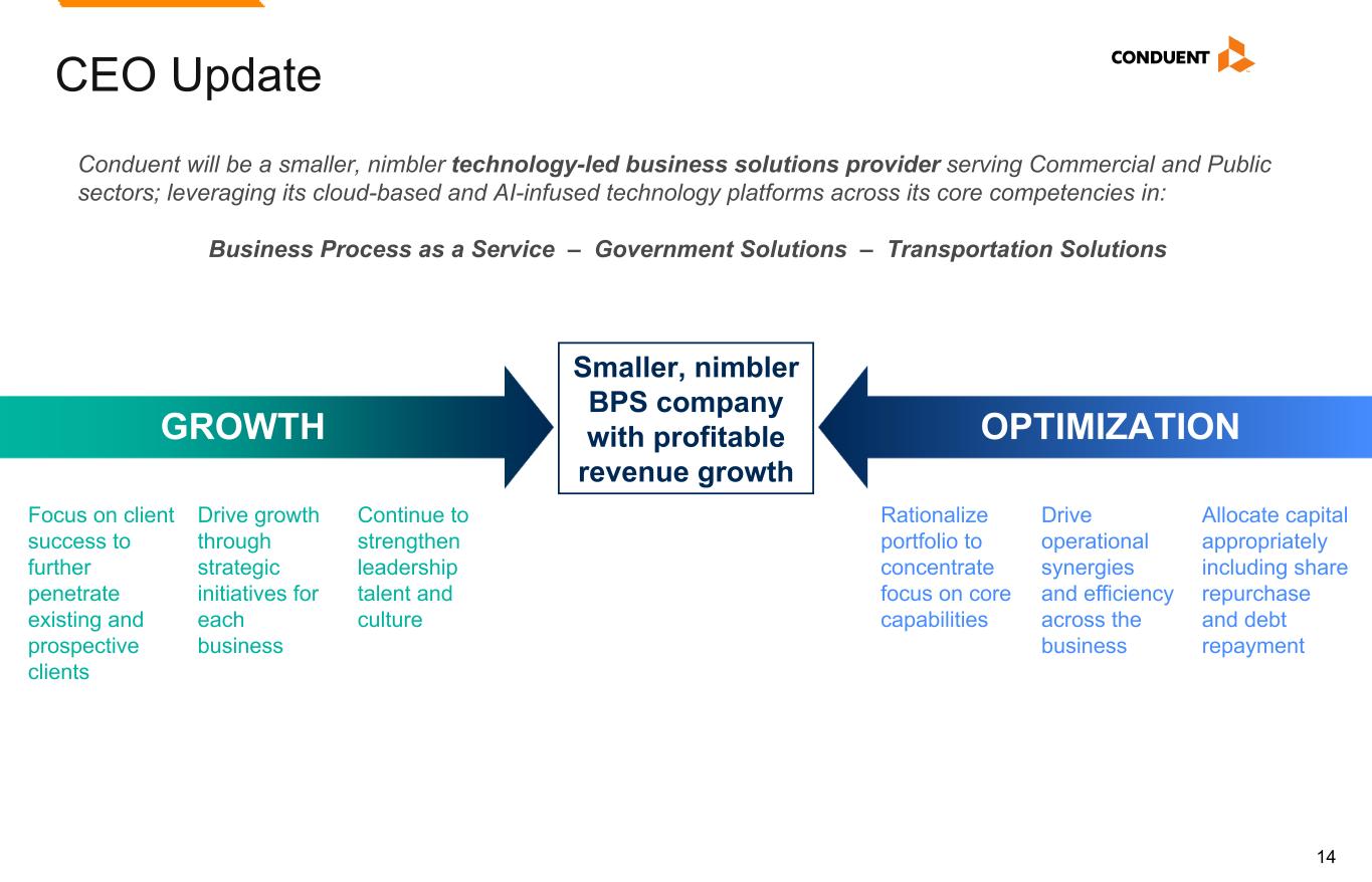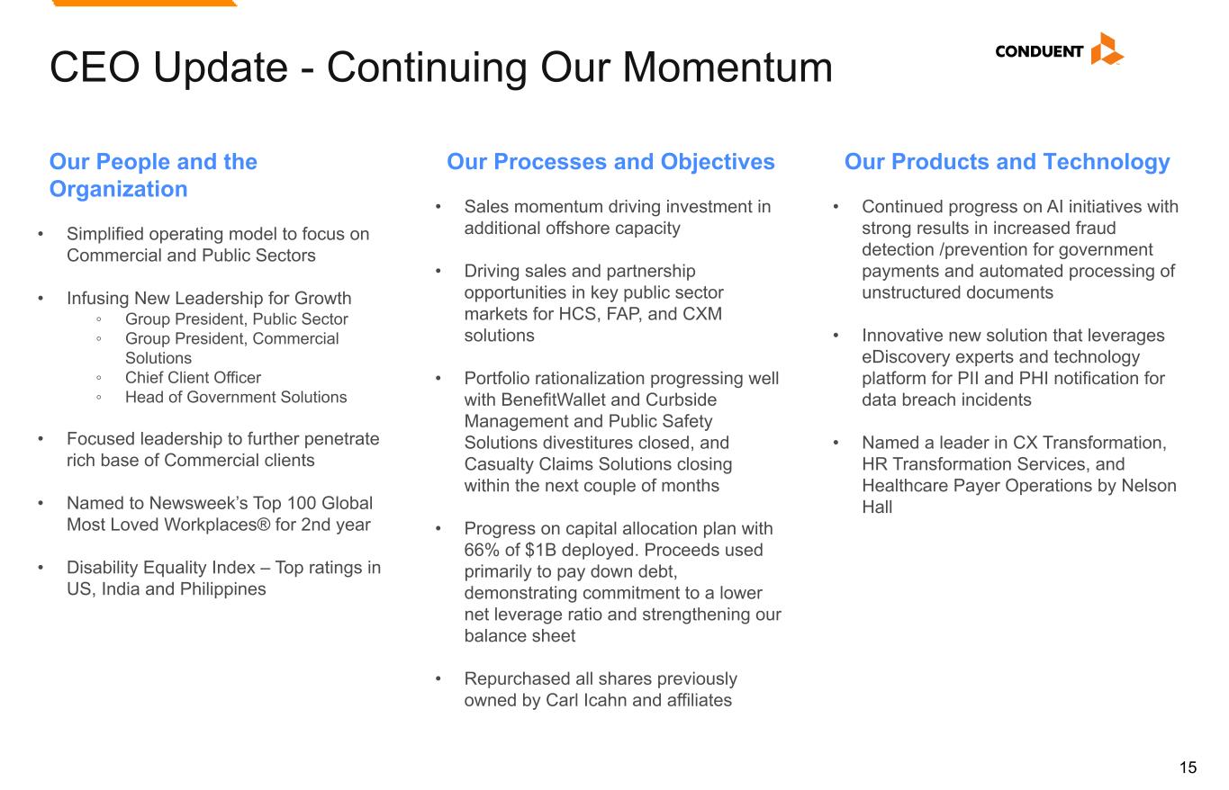 14 CEO Update Conduent will be a smaller, nimbler technology-led business solutions provider serving Commercial and Public sectors; leveraging its cloud-based and AI-infused technology platforms across its core competencies in: Business Process as a Service – Government Solutions – Transportation Solutions Smaller, nimbler BPS company with profitable revenue growth Focus on client success to further penetrate existing and prospective clients Drive growth through strategic initiatives for each business Continue to strengthen leadership talent and culture Rationalize portfolio to concentrate focus on core capabilities Drive operational synergies and efficiency across the business Allocate capital appropriately including share repurchase and debt repayment GROWTH OPTIMIZATION