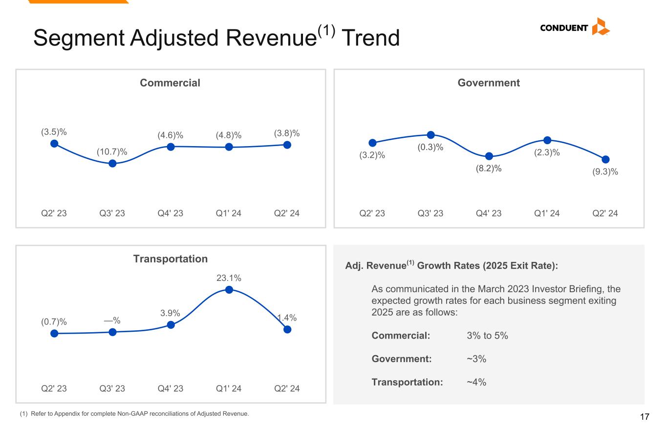 17 Government (3.2)% (0.3)% (8.2)% (2.3)% (9.3)% Q2' 23 Q3' 23 Q4' 23 Q1' 24 Q2' 24 Transportation (0.7)% —% 3.9% 23.1% 1.4% Q2' 23 Q3' 23 Q4' 23 Q1' 24 Q2' 24 Commercial (3.5)% (10.7)% (4.6)% (4.8)% (3.8)% Q2' 23 Q3' 23 Q4' 23 Q1' 24 Q2' 24 Segment Adjusted Revenue(1) Trend Adj. Revenue(1) Growth Rates (2025 Exit Rate): As communicated in the March 2023 Investor Briefing, the expected growth rates for each business segment exiting 2025 are as follows: Commercial: 3% to 5% Government: ~3% Transportation: ~4% (1) Refer to Appendix for complete Non-GAAP reconciliations of Adjusted Revenue.