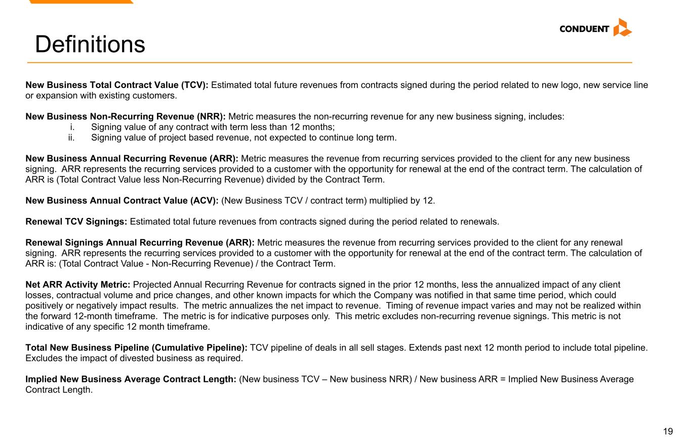 19 Definitions New Business Total Contract Value (TCV): Estimated total future revenues from contracts signed during the period related to new logo, new service line or expansion with existing customers. New Business Non-Recurring Revenue (NRR): Metric measures the non-recurring revenue for any new business signing, includes: i. Signing value of any contract with term less than 12 months; ii. Signing value of project based revenue, not expected to continue long term. New Business Annual Recurring Revenue (ARR): Metric measures the revenue from recurring services provided to the client for any new business signing. ARR represents the recurring services provided to a customer with the opportunity for renewal at the end of the contract term. The calculation of ARR is (Total Contract Value less Non-Recurring Revenue) divided by the Contract Term. New Business Annual Contract Value (ACV): (New Business TCV / contract term) multiplied by 12. Renewal TCV Signings: Estimated total future revenues from contracts signed during the period related to renewals. Renewal Signings Annual Recurring Revenue (ARR): Metric measures the revenue from recurring services provided to the client for any renewal signing. ARR represents the recurring services provided to a customer with the opportunity for renewal at the end of the contract term. The calculation of ARR is: (Total Contract Value - Non-Recurring Revenue) / the Contract Term. Net ARR Activity Metric: Projected Annual Recurring Revenue for contracts signed in the prior 12 months, less the annualized impact of any client losses, contractual volume and price changes, and other known impacts for which the Company was notified in that same time period, which could positively or negatively impact results. The metric annualizes the net impact to revenue. Timing of revenue impact varies and may not be realized within the forward 12-month timeframe. The metric is for indicative purposes only. This metric excludes non-recurring revenue signings. This metric is not indicative of any specific 12 month timeframe. Total New Business Pipeline (Cumulative Pipeline): TCV pipeline of deals in all sell stages. Extends past next 12 month period to include total pipeline. Excludes the impact of divested business as required. Implied New Business Average Contract Length: (New business TCV – New business NRR) / New business ARR = Implied New Business Average Contract Length.