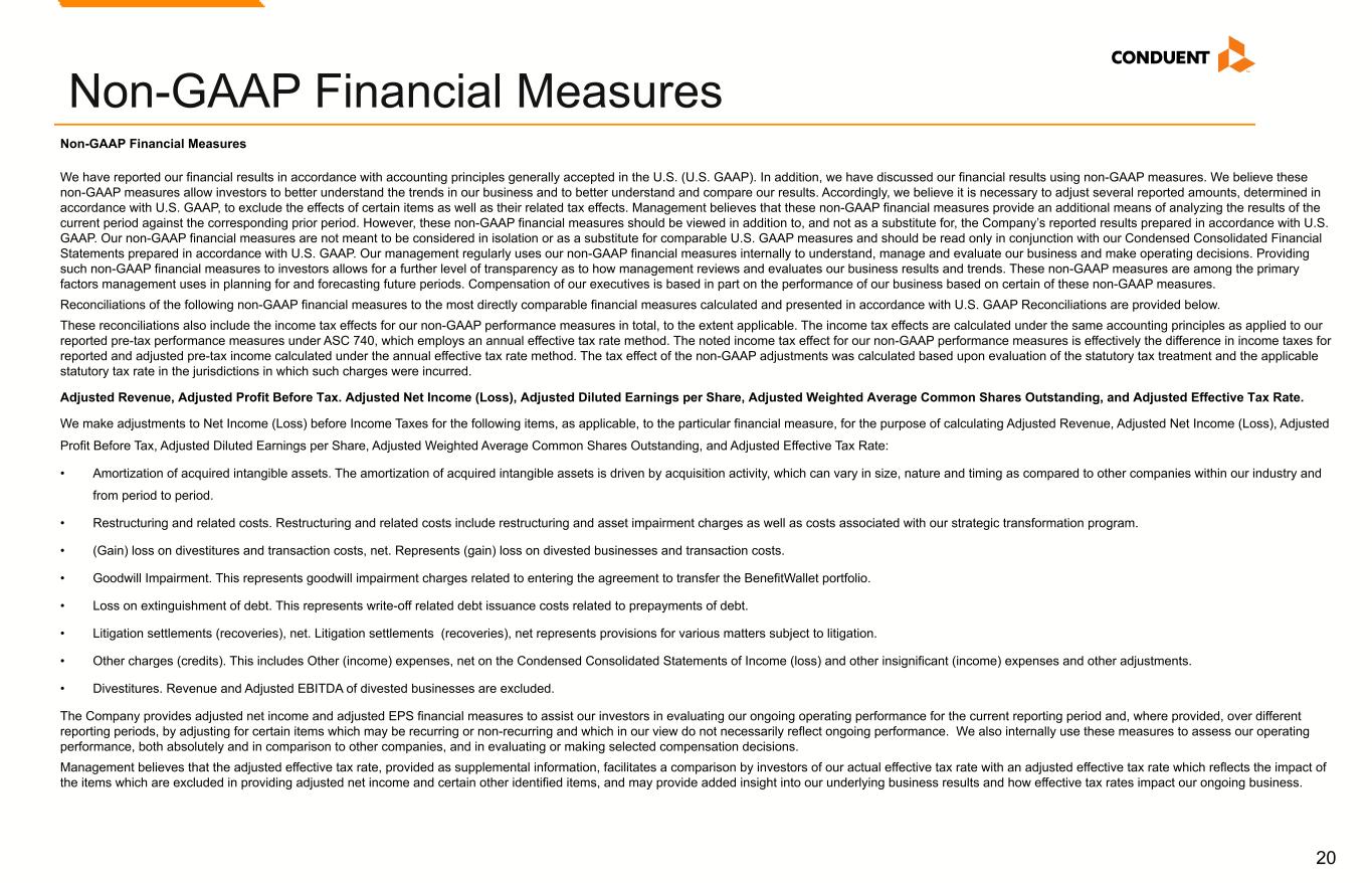 20 Non-GAAP Financial Measures We have reported our financial results in accordance with accounting principles generally accepted in the U.S. (U.S. GAAP). In addition, we have discussed our financial results using non-GAAP measures. We believe these non-GAAP measures allow investors to better understand the trends in our business and to better understand and compare our results. Accordingly, we believe it is necessary to adjust several reported amounts, determined in accordance with U.S. GAAP, to exclude the effects of certain items as well as their related tax effects. Management believes that these non-GAAP financial measures provide an additional means of analyzing the results of the current period against the corresponding prior period. However, these non-GAAP financial measures should be viewed in addition to, and not as a substitute for, the Company’s reported results prepared in accordance with U.S. GAAP. Our non-GAAP financial measures are not meant to be considered in isolation or as a substitute for comparable U.S. GAAP measures and should be read only in conjunction with our Condensed Consolidated Financial Statements prepared in accordance with U.S. GAAP. Our management regularly uses our non-GAAP financial measures internally to understand, manage and evaluate our business and make operating decisions. Providing such non-GAAP financial measures to investors allows for a further level of transparency as to how management reviews and evaluates our business results and trends. These non-GAAP measures are among the primary factors management uses in planning for and forecasting future periods. Compensation of our executives is based in part on the performance of our business based on certain of these non-GAAP measures. Reconciliations of the following non-GAAP financial measures to the most directly comparable financial measures calculated and presented in accordance with U.S. GAAP Reconciliations are provided below. These reconciliations also include the income tax effects for our non-GAAP performance measures in total, to the extent applicable. The income tax effects are calculated under the same accounting principles as applied to our reported pre-tax performance measures under ASC 740, which employs an annual effective tax rate method. The noted income tax effect for our non-GAAP performance measures is effectively the difference in income taxes for reported and adjusted pre-tax income calculated under the annual effective tax rate method. The tax effect of the non-GAAP adjustments was calculated based upon evaluation of the statutory tax treatment and the applicable statutory tax rate in the jurisdictions in which such charges were incurred. Adjusted Revenue, Adjusted Profit Before Tax. Adjusted Net Income (Loss), Adjusted Diluted Earnings per Share, Adjusted Weighted Average Common Shares Outstanding, and Adjusted Effective Tax Rate. We make adjustments to Net Income (Loss) before Income Taxes for the following items, as applicable, to the particular financial measure, for the purpose of calculating Adjusted Revenue, Adjusted Net Income (Loss), Adjusted Profit Before Tax, Adjusted Diluted Earnings per Share, Adjusted Weighted Average Common Shares Outstanding, and Adjusted Effective Tax Rate: • Amortization of acquired intangible assets. The amortization of acquired intangible assets is driven by acquisition activity, which can vary in size, nature and timing as compared to other companies within our industry and from period to period. • Restructuring and related costs. Restructuring and related costs include restructuring and asset impairment charges as well as costs associated with our strategic transformation program. • (Gain) loss on divestitures and transaction costs, net. Represents (gain) loss on divested businesses and transaction costs. • Goodwill Impairment. This represents goodwill impairment charges related to entering the agreement to transfer the BenefitWallet portfolio. • Loss on extinguishment of debt. This represents write-off related debt issuance costs related to prepayments of debt. • Litigation settlements (recoveries), net. Litigation settlements (recoveries), net represents provisions for various matters subject to litigation. • Other charges (credits). This includes Other (income) expenses, net on the Condensed Consolidated Statements of Income (loss) and other insignificant (income) expenses and other adjustments. • Divestitures. Revenue and Adjusted EBITDA of divested businesses are excluded. The Company provides adjusted net income and adjusted EPS financial measures to assist our investors in evaluating our ongoing operating performance for the current reporting period and, where provided, over different reporting periods, by adjusting for certain items which may be recurring or non-recurring and which in our view do not necessarily reflect ongoing performance. We also internally use these measures to assess our operating performance, both absolutely and in comparison to other companies, and in evaluating or making selected compensation decisions. Management believes that the adjusted effective tax rate, provided as supplemental information, facilitates a comparison by investors of our actual effective tax rate with an adjusted effective tax rate which reflects the impact of the items which are excluded in providing adjusted net income and certain other identified items, and may provide added insight into our underlying business results and how effective tax rates impact our ongoing business. Non-GAAP Financial Measures