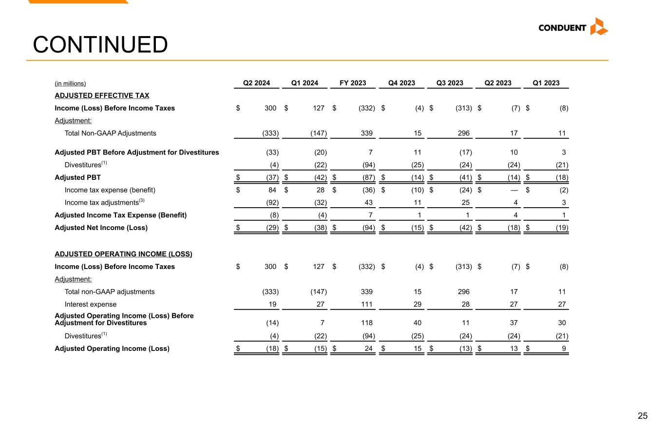 24 Non-GAAP Reconciliations (in millions) Q2 2024 Q1 2024 FY 2023 Q4 2023 Q3 2023 Q2 2023 Q1 2023 REVENUE Revenue $ 828 $ 921 $ 3,722 $ 953 $ 932 $ 915 $ 922 Adjustment: Divestitures(1) (17) (63) (256) (66) (64) (64) (62) Adjusted Revenue 811 858 3,466 887 868 851 860 Foreign currency impact 1 (1) (11) (6) (7) (1) 3 Revenue at Constant Currency $ 812 $ 857 $ 3,455 $ 881 $ 861 $ 850 $ 863 ADJUSTED NET INCOME (LOSS) Income (Loss) From Continuing Operations $ 216 $ 99 $ (296) $ 6 $ (289) $ (7) $ (6) Adjustments: Amortization of acquired intangible assets(2) 2 1 7 2 1 2 2 Restructuring and related costs 8 9 62 13 7 13 29 Loss on extinguishment of debt 3 2 — — — — — Goodwill impairment — — 287 — 287 — — (Gain) loss on divestitures and transaction costs, net (347) (161) 10 2 3 3 2 Litigation settlements (recoveries), net 1 4 (30) (8) — (1) (21) Other charges (credits) — (2) 3 6 (2) — (1) Total Non-GAAP Adjustments (333) (147) 339 15 296 17 11 Income tax adjustments(3) 92 32 (43) (11) (25) (4) (3) Adjusted Net Income (Loss) Before Adjustment for Divestitures (25) (16) — 10 (18) 6 2 Divestitures(1) $ (4) $ (22) $ (94) $ (25) $ (24) $ (24) $ (21) Adjusted Net Income (Loss) $ (29) $ (38) $ (94) $ (15) $ (42) $ (18) $ (19) Adjusted Revenue, Revenue at Constant Currency, Adjusted Net Income (Loss), Adjusted Effective Tax Rate, Adjusted Operating Income (Loss) and Adjusted EBITDA (see footnotes on last page of Non-GAAP reconciliations)