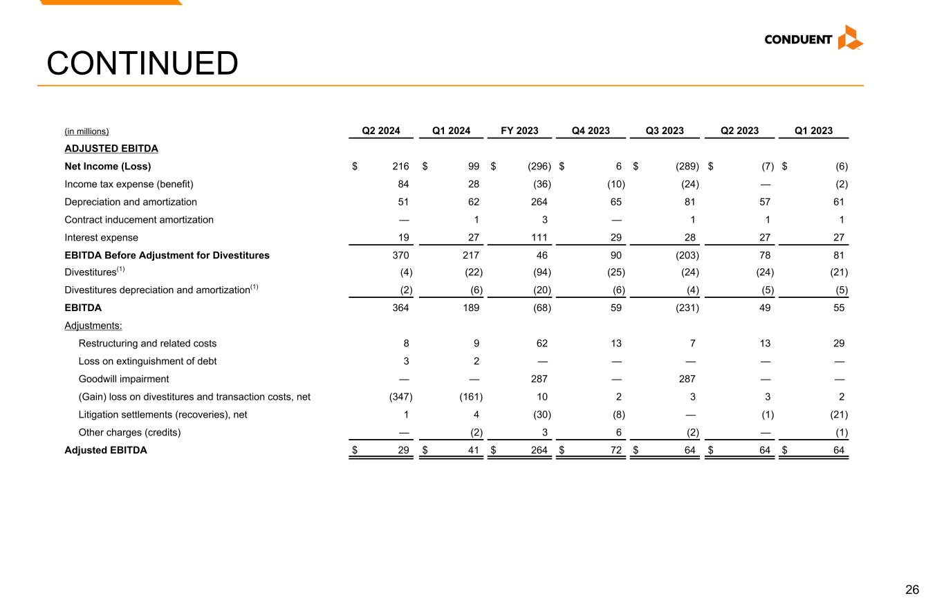 25 CONTINUED (in millions) Q2 2024 Q1 2024 FY 2023 Q4 2023 Q3 2023 Q2 2023 Q1 2023 ADJUSTED EFFECTIVE TAX Income (Loss) Before Income Taxes $ 300 $ 127 $ (332) $ (4) $ (313) $ (7) $ (8) Adjustment: Total Non-GAAP Adjustments (333) (147) 339 15 296 17 11 Adjusted PBT Before Adjustment for Divestitures (33) (20) 7 11 (17) 10 3 Divestitures(1) (4) (22) (94) (25) (24) (24) (21) Adjusted PBT $ (37) $ (42) $ (87) $ (14) $ (41) $ (14) $ (18) Income tax expense (benefit) $ 84 $ 28 $ (36) $ (10) $ (24) $ — $ (2) Income tax adjustments(3) (92) (32) 43 11 25 4 3 Adjusted Income Tax Expense (Benefit) (8) (4) 7 1 1 4 1 Adjusted Net Income (Loss) $ (29) $ (38) $ (94) $ (15) $ (42) $ (18) $ (19) ADJUSTED OPERATING INCOME (LOSS) Income (Loss) Before Income Taxes $ 300 $ 127 $ (332) $ (4) $ (313) $ (7) $ (8) Adjustment: Total non-GAAP adjustments (333) (147) 339 15 296 17 11 Interest expense 19 27 111 29 28 27 27 Adjusted Operating Income (Loss) Before Adjustment for Divestitures (14) 7 118 40 11 37 30 Divestitures(1) (4) (22) (94) (25) (24) (24) (21) Adjusted Operating Income (Loss) $ (18) $ (15) $ 24 $ 15 $ (13) $ 13 $ 9