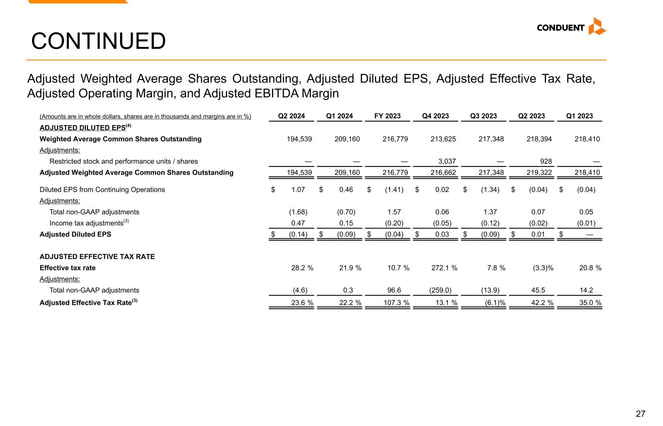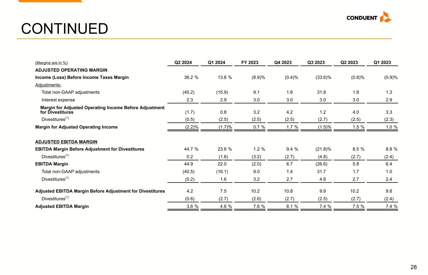 27 CONTINUED (Amounts are in whole dollars, shares are in thousands and margins are in %) Q2 2024 Q1 2024 FY 2023 Q4 2023 Q3 2023 Q2 2023 Q1 2023 ADJUSTED DILUTED EPS(4) Weighted Average Common Shares Outstanding 194,539 209,160 216,779 213,625 217,348 218,394 218,410 Adjustments: Restricted stock and performance units / shares — — — 3,037 — 928 — Adjusted Weighted Average Common Shares Outstanding 194,539 209,160 216,779 216,662 217,348 219,322 218,410 Diluted EPS from Continuing Operations $ 1.07 $ 0.46 $ (1.41) $ 0.02 $ (1.34) $ (0.04) $ (0.04) Adjustments: Total non-GAAP adjustments (1.68) (0.70) 1.57 0.06 1.37 0.07 0.05 Income tax adjustments(3) 0.47 0.15 (0.20) (0.05) (0.12) (0.02) (0.01) Adjusted Diluted EPS $ (0.14) $ (0.09) $ (0.04) $ 0.03 $ (0.09) $ 0.01 $ — ADJUSTED EFFECTIVE TAX RATE Effective tax rate 28.2 % 21.9 % 10.7 % 272.1 % 7.8 % (3.3) % 20.8 % Adjustments: Total non-GAAP adjustments (4.6) 0.3 96.6 (259.0) (13.9) 45.5 14.2 Adjusted Effective Tax Rate(3) 23.6 % 22.2 % 107.3 % 13.1 % (6.1) % 42.2 % 35.0 % Adjusted Weighted Average Shares Outstanding, Adjusted Diluted EPS, Adjusted Effective Tax Rate, Adjusted Operating Margin, and Adjusted EBITDA Margin