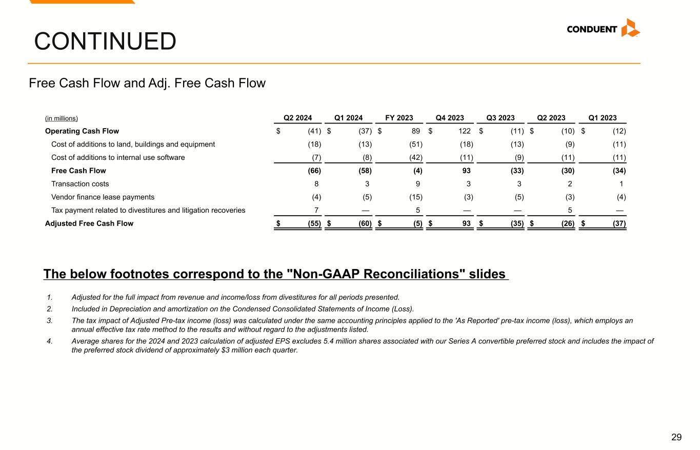 28 (Margins are in %) Q2 2024 Q1 2024 FY 2023 Q4 2023 Q3 2023 Q2 2023 Q1 2023 ADJUSTED OPERATING MARGIN Income (Loss) Before Income Taxes Margin 36.2 % 13.8 % (8.9) % (0.4) % (33.6) % (0.8) % (0.9) % Adjustments: Total non-GAAP adjustments (40.2) (15.9) 9.1 1.6 31.8 1.8 1.3 Interest expense 2.3 2.9 3.0 3.0 3.0 3.0 2.9 Margin for Adjusted Operating Income Before Adjustment for Divestitures (1.7) 0.8 3.2 4.2 1.2 4.0 3.3 Divestitures(1) (0.5) (2.5) (2.5) (2.5) (2.7) (2.5) (2.3) Margin for Adjusted Operating Income (2.2) % (1.7) % 0.7 % 1.7 % (1.5) % 1.5 % 1.0 % ADJUSTED EBITDA MARGIN EBITDA Margin Before Adjustment for Divestitures 44.7 % 23.6 % 1.2 % 9.4 % (21.8) % 8.5 % 8.8 % Divestitures(1) 0.2 (1.6) (3.2) (2.7) (4.8) (2.7) (2.4) EBITDA Margin 44.9 22.0 (2.0) 6.7 (26.6) 5.8 6.4 Total non-GAAP adjustments (40.5) (16.1) 9.0 1.4 31.7 1.7 1.0 Divestitures(1) (0.2) 1.6 3.2 2.7 4.8 2.7 2.4 Adjusted EBITDA Margin Before Adjustment for Divestitures 4.2 7.5 10.2 10.8 9.9 10.2 9.8 Divestitures(1) (0.6) (2.7) (2.6) (2.7) (2.5) (2.7) (2.4) Adjusted EBITDA Margin 3.6 % 4.8 % 7.6 % 8.1 % 7.4 % 7.5 % 7.4 % CONTINUED