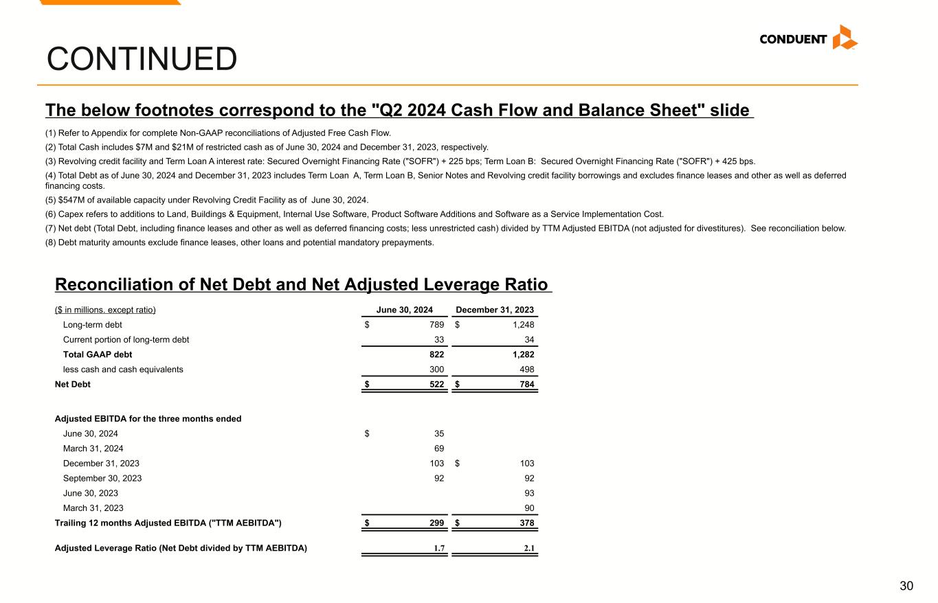 29 CONTINUED (in millions) Q2 2024 Q1 2024 FY 2023 Q4 2023 Q3 2023 Q2 2023 Q1 2023 Operating Cash Flow $ (41) $ (37) $ 89 $ 122 $ (11) $ (10) $ (12) Cost of additions to land, buildings and equipment (18) (13) (51) (18) (13) (9) (11) Cost of additions to internal use software (7) (8) (42) (11) (9) (11) (11) Free Cash Flow (66) (58) (4) 93 (33) (30) (34) Transaction costs 8 3 9 3 3 2 1 Vendor finance lease payments (4) (5) (15) (3) (5) (3) (4) Tax payment related to divestitures and litigation recoveries 7 — 5 — — 5 — Adjusted Free Cash Flow $ (55) $ (60) $ (5) $ 93 $ (35) $ (26) $ (37) Free Cash Flow and Adj. Free Cash Flow The below footnotes correspond to the "Non-GAAP Reconciliations" slides 1. Adjusted for the full impact from revenue and income/loss from divestitures for all periods presented. 2. Included in Depreciation and amortization on the Condensed Consolidated Statements of Income (Loss). 3. The tax impact of Adjusted Pre-tax income (loss) was calculated under the same accounting principles applied to the 'As Reported' pre-tax income (loss), which employs an annual effective tax rate method to the results and without regard to the adjustments listed. 4. Average shares for the 2024 and 2023 calculation of adjusted EPS excludes 5.4 million shares associated with our Series A convertible preferred stock and includes the impact of the preferred stock dividend of approximately $3 million each quarter.