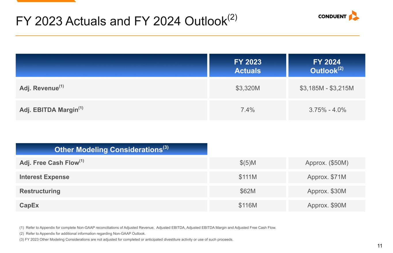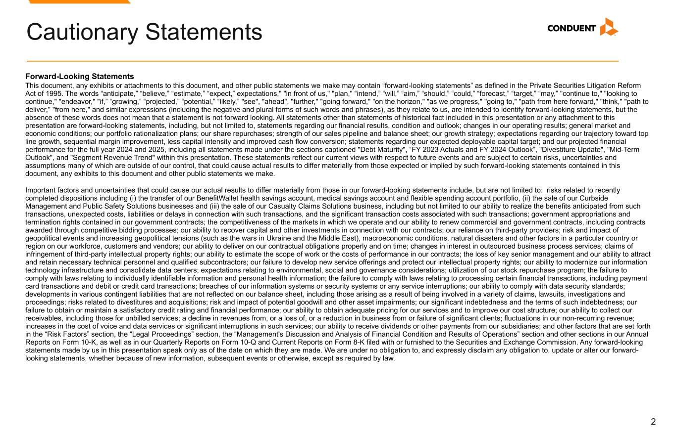 2 Forward-Looking Statements This document, any exhibits or attachments to this document, and other public statements we make may contain “forward-looking statements” as defined in the Private Securities Litigation Reform Act of 1995. The words “anticipate,” “believe,” “estimate,” “expect,” expectations," "in front of us," "plan," “intend,” “will,” “aim,” “should,” “could,” “forecast,” “target,” “may,” "continue to," "looking to continue," "endeavor," "if,” “growing,” “projected,” “potential,” “likely,” "see", "ahead", "further," "going forward," "on the horizon," "as we progress," "going to," "path from here forward," "think," "path to deliver," "from here," and similar expressions (including the negative and plural forms of such words and phrases), as they relate to us, are intended to identify forward-looking statements, but the absence of these words does not mean that a statement is not forward looking. All statements other than statements of historical fact included in this presentation or any attachment to this presentation are forward-looking statements, including, but not limited to, statements regarding our financial results, condition and outlook; changes in our operating results; general market and economic conditions; our portfolio rationalization plans; our share repurchases; strength of our sales pipeline and balance sheet; our growth strategy; expectations regarding our trajectory toward top line growth, sequential margin improvement, less capital intensity and improved cash flow conversion; statements regarding our expected deployable capital target; and our projected financial performance for the full year 2024 and 2025, including all statements made under the sections captioned "Debt Maturity", “FY 2023 Actuals and FY 2024 Outlook”, "Divestiture Update", "Mid-Term Outlook", and "Segment Revenue Trend" within this presentation. These statements reflect our current views with respect to future events and are subject to certain risks, uncertainties and assumptions many of which are outside of our control, that could cause actual results to differ materially from those expected or implied by such forward-looking statements contained in this document, any exhibits to this document and other public statements we make. Important factors and uncertainties that could cause our actual results to differ materially from those in our forward-looking statements include, but are not limited to: risks related to recently completed dispositions including (i) the transfer of our BenefitWallet health savings account, medical savings account and flexible spending account portfolio, (ii) the sale of our Curbside Management and Public Safety Solutions businesses and (iii) the sale of our Casualty Claims Solutions business, including but not limited to our ability to realize the benefits anticipated from such transactions, unexpected costs, liabilities or delays in connection with such transactions, and the significant transaction costs associated with such transactions; government appropriations and termination rights contained in our government contracts; the competitiveness of the markets in which we operate and our ability to renew commercial and government contracts, including contracts awarded through competitive bidding processes; our ability to recover capital and other investments in connection with our contracts; our reliance on third-party providers; risk and impact of geopolitical events and increasing geopolitical tensions (such as the wars in Ukraine and the Middle East), macroeconomic conditions, natural disasters and other factors in a particular country or region on our workforce, customers and vendors; our ability to deliver on our contractual obligations properly and on time; changes in interest in outsourced business process services; claims of infringement of third-party intellectual property rights; our ability to estimate the scope of work or the costs of performance in our contracts; the loss of key senior management and our ability to attract and retain necessary technical personnel and qualified subcontractors; our failure to develop new service offerings and protect our intellectual property rights; our ability to modernize our information technology infrastructure and consolidate data centers; expectations relating to environmental, social and governance considerations; utilization of our stock repurchase program; the failure to comply with laws relating to individually identifiable information and personal health information; the failure to comply with laws relating to processing certain financial transactions, including payment card transactions and debit or credit card transactions; breaches of our information systems or security systems or any service interruptions; our ability to comply with data security standards; developments in various contingent liabilities that are not reflected on our balance sheet, including those arising as a result of being involved in a variety of claims, lawsuits, investigations and proceedings; risks related to divestitures and acquisitions; risk and impact of potential goodwill and other asset impairments; our significant indebtedness and the terms of such indebtedness; our failure to obtain or maintain a satisfactory credit rating and financial performance; our ability to obtain adequate pricing for our services and to improve our cost structure; our ability to collect our receivables, including those for unbilled services; a decline in revenues from, or a loss of, or a reduction in business from or failure of significant clients; fluctuations in our non-recurring revenue; increases in the cost of voice and data services or significant interruptions in such services; our ability to receive dividends or other payments from our subsidiaries; and other factors that are set forth in the “Risk Factors” section, the “Legal Proceedings” section, the “M