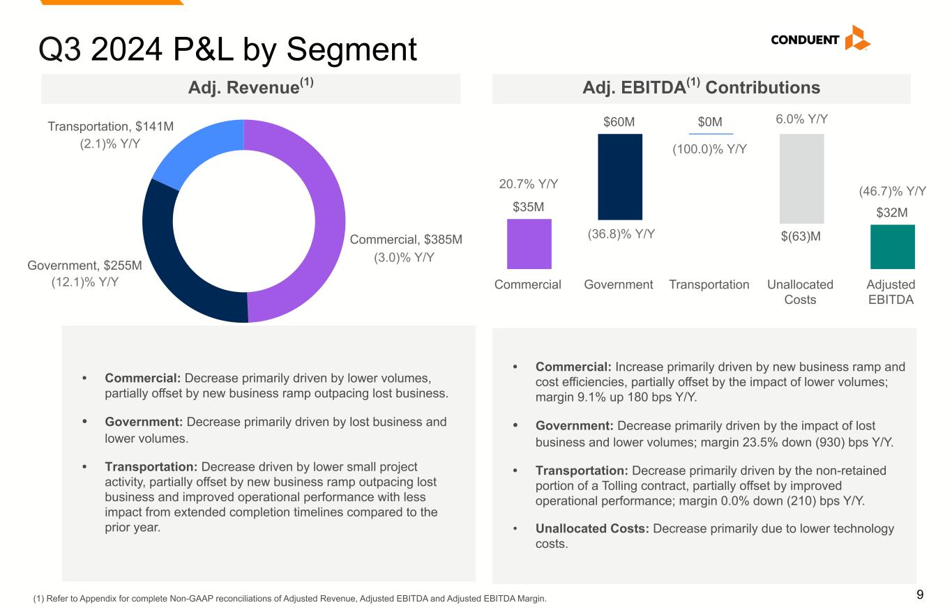 8 Q3 2024 P&L Metrics $831M $781M Q3 2023 Q3 2024 $0M $500M $1,000M (6.0)% Y/Y (6.0)% in CC Adj. Revenue(1) $60M / 7.2% $32M / 4.1% Q3 2023 Q3 2024 $0M $25M $50M $75M Adj. EBITDA(1) / Adj. EBITDA Margin(1) (46.7)% Y/Y • Adj. Revenue(1): Decline primarily driven by lost business, partially offset by new business ramp particularly in our Commercial and Transportation segments. • Adj. EBITDA and Adj. EBITDA Margin(1): Decline primarily driven by the impact of lost business and lower volumes, as well as the impact from stranded cost from divested assets, partially offset by new business ramp and cost efficiencies. (5.7)% (4.5)% (0.2)% (5.0)% (6.0)% Q3' 23 Q4' 23 Q1' 24 Q2' 24 Q3' 24 Adj. Revenue(1) Trend (Y/Y Compare) (1) Refer to Appendix for complete Non-GAAP reconciliations of Adjusted Revenue, Adjusted EBITDA and Adjusted EBITDA Margin.