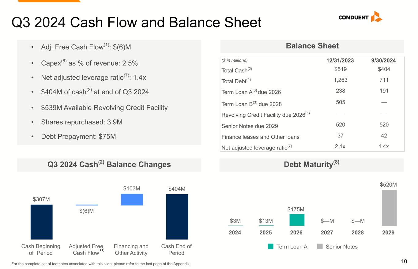 9 $35M $60M $0M $(63)M $32M Commercial Government Transportation Unallocated Costs Adjusted EBITDA Q3 2024 P&L by Segment (1) Refer to Appendix for complete Non-GAAP reconciliations of Adjusted Revenue, Adjusted EBITDA and Adjusted EBITDA Margin. Commercial, $385M Government, $255M Transportation, $141M (2.1)% Y/Y (12.1)% Y/Y (3.0)% Y/Y (100.0)% Y/Y (36.8)% Y/Y 20.7% Y/Y Adj. Revenue(1) Adj. EBITDA(1) Contributions (46.7)% Y/Y 6.0% Y/Y • Commercial: Decrease primarily driven by lower volumes, partially offset by new business ramp outpacing lost business. • Government: Decrease primarily driven by lost business and lower volumes. • Transportation: Decrease driven by lower small project activity, partially offset by new business ramp outpacing lost business and improved operational performance with less impact from extended completion timelines compared to the prior year. • Commercial: Increase primarily driven by new business ramp and cost efficiencies, partially offset by the impact of lower volumes; margin 9.1% up 180 bps Y/Y. • Government: Decrease primarily driven by the impact of lost business and lower volumes; margin 23.5% down (930) bps Y/Y. • Transportation: Decrease primarily driven by the non-retained portion of a Tolling contract, partially offset by improved operational performance; margin 0.0% down (210) bps Y/Y. • Unallocated Costs: Decrease primarily due to lower technology costs.