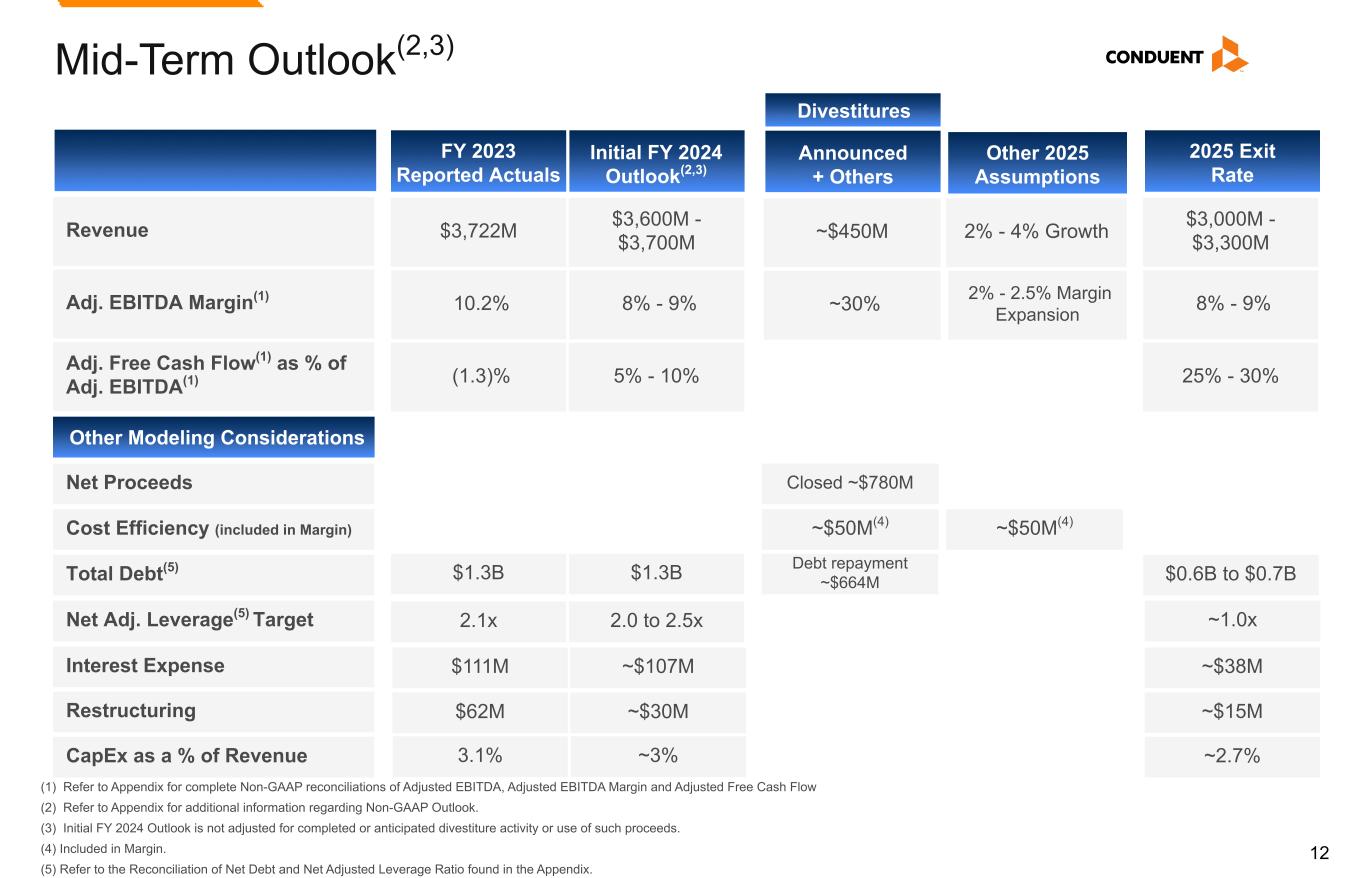 11 FY 2023 Actuals and FY 2024 Outlook(2) (1) Refer to Appendix for complete Non-GAAP reconciliations of Adjusted Revenue, Adjusted EBITDA, Adjusted EBITDA Margin and Adjusted Free Cash Flow. (2) Refer to Appendix for additional information regarding Non-GAAP Outlook. (3) FY 2023 Other Modeling Considerations are not adjusted for completed or anticipated divestiture activity or use of such proceeds. FY 2023 Actuals FY 2024 Outlook(2) $3,320MAdj. Revenue(1) Other Modeling Considerations(3) Adj. EBITDA Margin(1) $3,185M - $3,215M Interest Expense Restructuring CapEx 7.4% 3.75% - 4.0% $111M Approx. $71M $62M $116M Approx. $30M Approx. $90M Adj. Free Cash Flow(1) $(5)M Approx. ($50M)