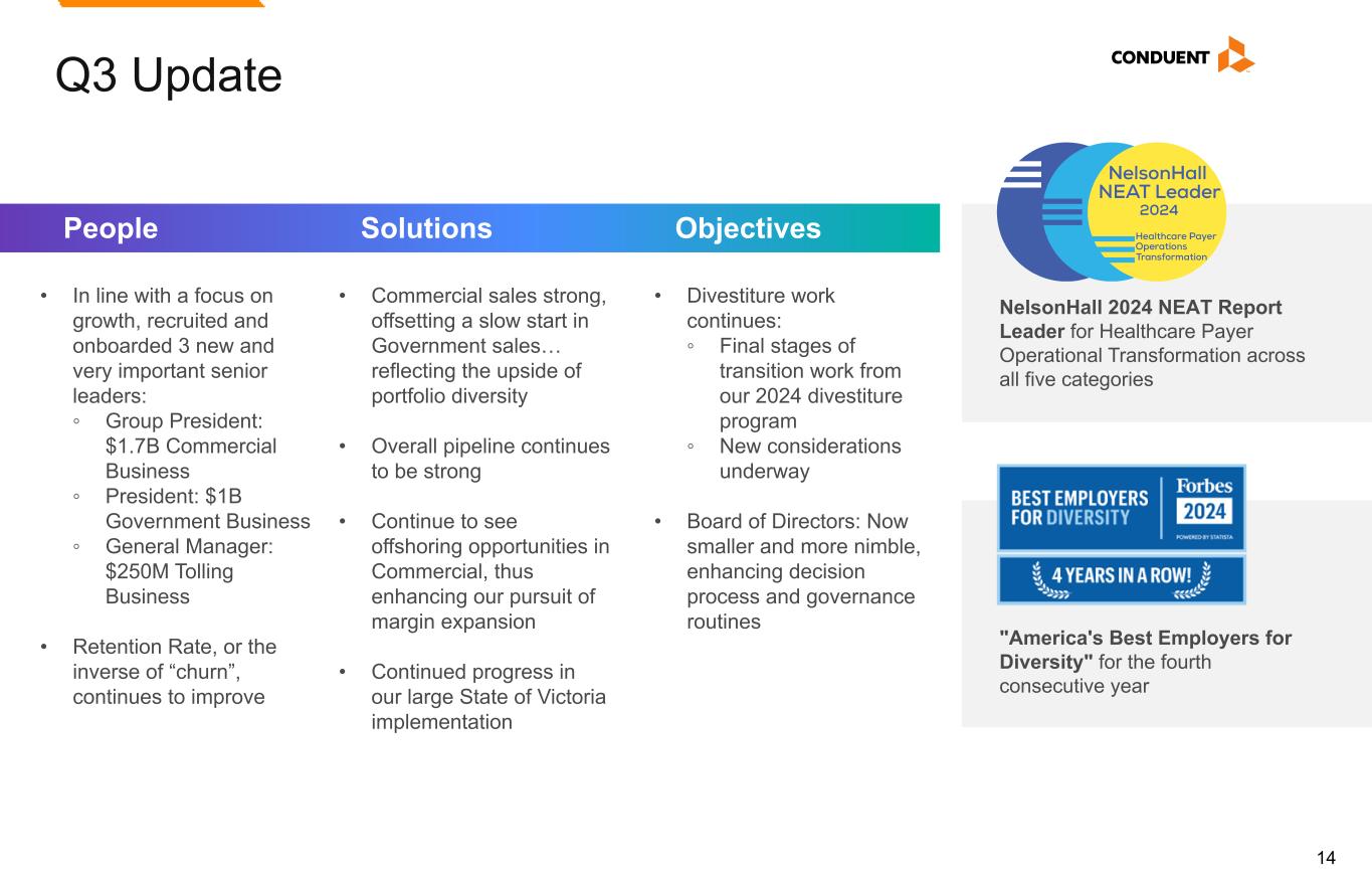 14 Q3 Update People NelsonHall 2024 NEAT Report Leader for Healthcare Payer Operational Transformation across all five categories "America's Best Employers for Diversity" for the fourth consecutive year • In line with a focus on growth, recruited and onboarded 3 new and very important senior leaders: ◦ Group President: $1.7B Commercial Business ◦ President: $1B Government Business ◦ General Manager: $250M Tolling Business • Retention Rate, or the inverse of “churn”, continues to improve Objectives • Divestiture work continues: ◦ Final stages of transition work from our 2024 divestiture program ◦ New considerations underway • Board of Directors: Now smaller and more nimble, enhancing decision process and governance routines Solutions • Commercial sales strong, offsetting a slow start in Government sales… reflecting the upside of portfolio diversity • Overall pipeline continues to be strong • Continue to see offshoring opportunities in Commercial, thus enhancing our pursuit of margin expansion • Continued progress in our large State of Victoria implementation