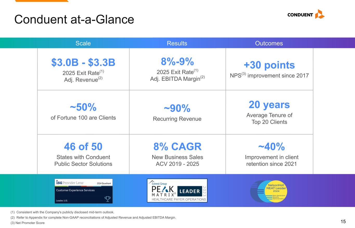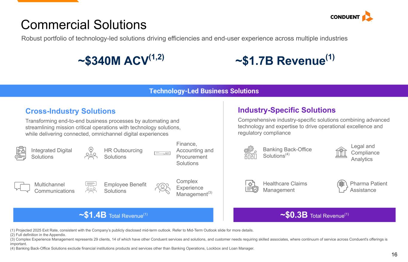 15 Conduent at-a-Glance ResultsScale Outcomes ~90% Recurring Revenue 8%-9% 2025 Exit Rate(1) Adj. EBITDA Margin(2) 8% CAGR New Business Sales ACV 2019 - 2025 $3.0B - $3.3B 2025 Exit Rate(1) Adj. Revenue(2) ~50% of Fortune 100 are Clients 46 of 50 States with Conduent Public Sector Solutions +30 points NPS(3) improvement since 2017 20 years Average Tenure of Top 20 Clients ~40% Improvement in client retention since 2021 (1) Consistent with the Company's publicly disclosed mid-term outlook. (2) Refer to Appendix for complete Non-GAAP reconciliations of Adjusted Revenue and Adjusted EBITDA Margin. (3) Net Promoter Score