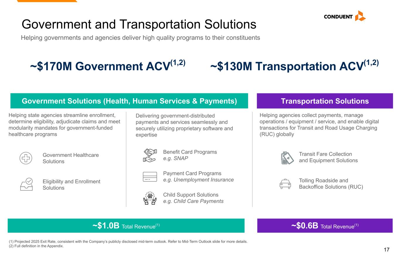 16 Commercial Solutions Robust portfolio of technology-led solutions driving efficiencies and end-user experience across multiple industries 2 ~$1.7B Revenue(1)~$340M ACV(1,2) Industry-Specific Solutions Comprehensive industry-specific solutions combining advanced technology and expertise to drive operational excellence and regulatory compliance ~$1.4B Total Revenue(1) ~$0.3B Total Revenue(1) Cross-Industry Solutions Transforming end-to-end business processes by automating and streamlining mission critical operations with technology solutions, while delivering connected, omnichannel digital experiences Finance, Accounting and Procurement Solutions Integrated Digital Solutions Healthcare Claims Management HR Outsourcing Solutions Multichannel Communications Complex Experience Management(3) Banking Back-Office Solutions(4) Legal and Compliance Analytics Employee Benefit Solutions Pharma Patient Assistance (1) Projected 2025 Exit Rate, consistent with the Company’s publicly disclosed mid-term outlook. Refer to Mid-Term Outlook slide for more details. (2) Full definition in the Appendix. (3) Complex Experience Management represents 29 clients, 14 of which have other Conduent services and solutions, and customer needs requiring skilled associates, where continuum of service across Conduent's offerings is important. (4) Banking Back-Office Solutions exclude financial institutions products and services other than Banking Operations, Lockbox and Loan Manager.