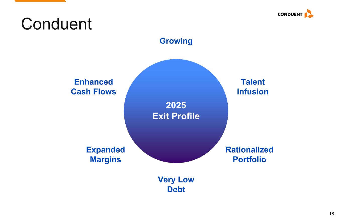 18 Conduent 2025 Exit Profile Rationalized Portfolio Talent Infusion Enhanced Cash Flows Expanded Margins Growing Very Low Debt