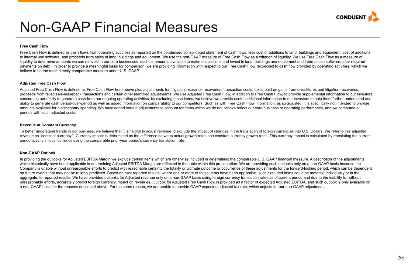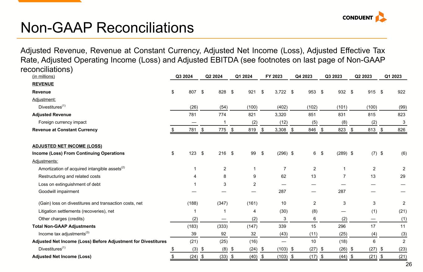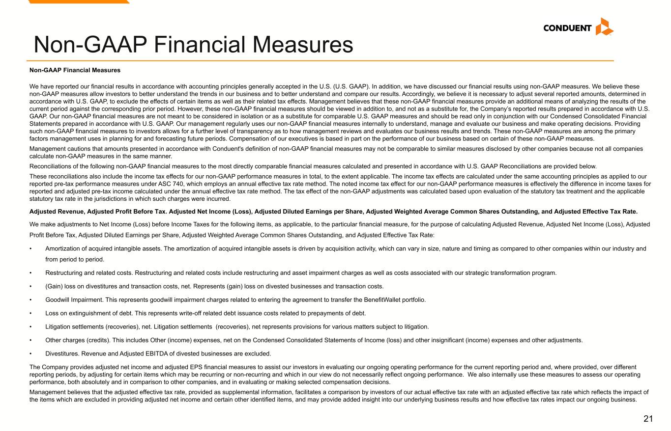 21 Non-GAAP Financial Measures We have reported our financial results in accordance with accounting principles generally accepted in the U.S. (U.S. GAAP). In addition, we have discussed our financial results using non-GAAP measures. We believe these non-GAAP measures allow investors to better understand the trends in our business and to better understand and compare our results. Accordingly, we believe it is necessary to adjust several reported amounts, determined in accordance with U.S. GAAP, to exclude the effects of certain items as well as their related tax effects. Management believes that these non-GAAP financial measures provide an additional means of analyzing the results of the current period against the corresponding prior period. However, these non-GAAP financial measures should be viewed in addition to, and not as a substitute for, the Company’s reported results prepared in accordance with U.S. GAAP. Our non-GAAP financial measures are not meant to be considered in isolation or as a substitute for comparable U.S. GAAP measures and should be read only in conjunction with our Condensed Consolidated Financial Statements prepared in accordance with U.S. GAAP. Our management regularly uses our non-GAAP financial measures internally to understand, manage and evaluate our business and make operating decisions. Providing such non-GAAP financial measures to investors allows for a further level of transparency as to how management reviews and evaluates our business results and trends. These non-GAAP measures are among the primary factors management uses in planning for and forecasting future periods. Compensation of our executives is based in part on the performance of our business based on certain of these non-GAAP measures. Management cautions that amounts presented in accordance with Conduent's definition of non-GAAP financial measures may not be comparable to similar measures disclosed by other companies because not all companies calculate non-GAAP measures in the same manner. Reconciliations of the following non-GAAP financial measures to the most directly comparable financial measures calculated and presented in accordance with U.S. GAAP Reconciliations are provided below. These reconciliations also include the income tax effects for our non-GAAP performance measures in total, to the extent applicable. The income tax effects are calculated under the same accounting principles as applied to our reported pre-tax performance measures under ASC 740, which employs an annual effective tax rate method. The noted income tax effect for our non-GAAP performance measures is effectively the difference in income taxes for reported and adjusted pre-tax income calculated under the annual effective tax rate method. The tax effect of the non-GAAP adjustments was calculated based upon evaluation of the statutory tax treatment and the applicable statutory tax rate in the jurisdictions in which such charges were incurred. Adjusted Revenue, Adjusted Profit Before Tax. Adjusted Net Income (Loss), Adjusted Diluted Earnings per Share, Adjusted Weighted Average Common Shares Outstanding, and Adjusted Effective Tax Rate. We make adjustments to Net Income (Loss) before Income Taxes for the following items, as applicable, to the particular financial measure, for the purpose of calculating Adjusted Revenue, Adjusted Net Income (Loss), Adjusted Profit Before Tax, Adjusted Diluted Earnings per Share, Adjusted Weighted Average Common Shares Outstanding, and Adjusted Effective Tax Rate: • Amortization of acquired intangible assets. The amortization of acquired intangible assets is driven by acquisition activity, which can vary in size, nature and timing as compared to other companies within our industry and from period to period. • Restructuring and related costs. Restructuring and related costs include restructuring and asset impairment charges as well as costs associated with our strategic transformation program. • (Gain) loss on divestitures and transaction costs, net. Represents (gain) loss on divested businesses and transaction costs. • Goodwill Impairment. This represents goodwill impairment charges related to entering the agreement to transfer the BenefitWallet portfolio. • Loss on extinguishment of debt. This represents write-off related debt issuance costs related to prepayments of debt. • Litigation settlements (recoveries), net. Litigation settlements (recoveries), net represents provisions for various matters subject to litigation. • Other charges (credits). This includes Other (income) expenses, net on the Condensed Consolidated Statements of Income (loss) and other insignificant (income) expenses and other adjustments. • Divestitures. Revenue and Adjusted EBITDA of divested businesses are excluded. The Company provides adjusted net income and adjusted EPS financial measures to assist our investors in evaluating our ongoing operating performance for the current reporting period and, where provided, over different reporting periods, by adjusting for certain items which may be recurring or non-recurring and which in our view do not necessarily reflect ongoing performance. We also internally use these measures to assess our operating performance, both absolutely and in comparison to other companies, and in evaluating or making selected compensation decisions. Management believes that the adjusted effective tax rate, provided as supplemental information, facilitates a comparison by investors of our actual effective tax rate with an adjusted effective tax rate which reflects the impact of the items which are excluded in providing adjusted net income and certain other identified items, and may provide added insight into our underlying business results and how effective tax rates impact our ongoing business. Non-GAAP Financial Measures