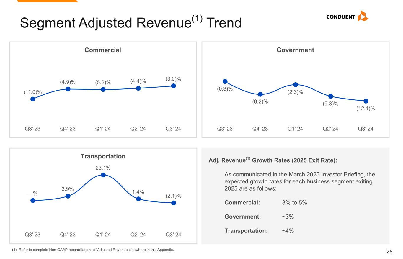 25 Government (0.3)% (8.2)% (2.3)% (9.3)% (12.1)% Q3' 23 Q4' 23 Q1' 24 Q2' 24 Q3' 24 Transportation —% 3.9% 23.1% 1.4% (2.1)% Q3' 23 Q4' 23 Q1' 24 Q2' 24 Q3' 24 Commercial (11.0)% (4.9)% (5.2)% (4.4)% (3.0)% Q3' 23 Q4' 23 Q1' 24 Q2' 24 Q3' 24 Segment Adjusted Revenue(1) Trend Adj. Revenue(1) Growth Rates (2025 Exit Rate): As communicated in the March 2023 Investor Briefing, the expected growth rates for each business segment exiting 2025 are as follows: Commercial: 3% to 5% Government: ~3% Transportation: ~4% (1) Refer to complete Non-GAAP reconciliations of Adjusted Revenue elsewhere in this Appendix.