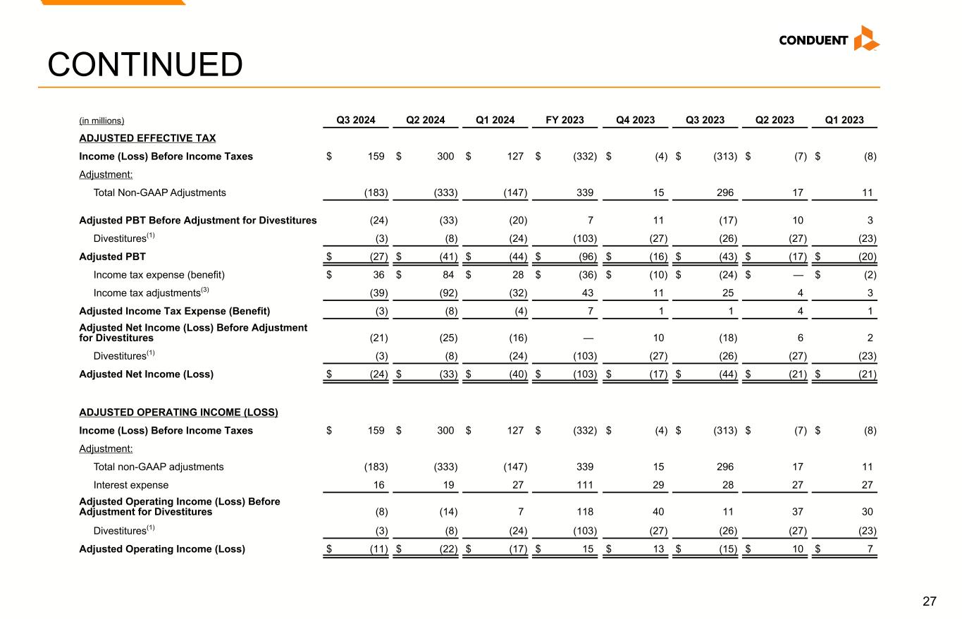 26 Non-GAAP Reconciliations (in millions) Q3 2024 Q2 2024 Q1 2024 FY 2023 Q4 2023 Q3 2023 Q2 2023 Q1 2023 REVENUE Revenue $ 807 $ 828 $ 921 $ 3,722 $ 953 $ 932 $ 915 $ 922 Adjustment: Divestitures(1) (26) (54) (100) (402) (102) (101) (100) (99) Adjusted Revenue 781 774 821 3,320 851 831 815 823 Foreign currency impact — 1 (2) (12) (5) (8) (2) 3 Revenue at Constant Currency $ 781 $ 775 $ 819 $ 3,308 $ 846 $ 823 $ 813 $ 826 ADJUSTED NET INCOME (LOSS) Income (Loss) From Continuing Operations $ 123 $ 216 $ 99 $ (296) $ 6 $ (289) $ (7) $ (6) Adjustments: Amortization of acquired intangible assets(2) 1 2 1 7 2 1 2 2 Restructuring and related costs 4 8 9 62 13 7 13 29 Loss on extinguishment of debt 1 3 2 — — — — — Goodwill impairment — — — 287 — 287 — — (Gain) loss on divestitures and transaction costs, net (188) (347) (161) 10 2 3 3 2 Litigation settlements (recoveries), net 1 1 4 (30) (8) — (1) (21) Other charges (credits) (2) — (2) 3 6 (2) — (1) Total Non-GAAP Adjustments (183) (333) (147) 339 15 296 17 11 Income tax adjustments(3) 39 92 32 (43) (11) (25) (4) (3) Adjusted Net Income (Loss) Before Adjustment for Divestitures (21) (25) (16) — 10 (18) 6 2 Divestitures(1) $ (3) $ (8) $ (24) $ (103) $ (27) $ (26) $ (27) $ (23) Adjusted Net Income (Loss) $ (24) $ (33) $ (40) $ (103) $ (17) $ (44) $ (21) $ (21) Adjusted Revenue, Revenue at Constant Currency, Adjusted Net Income (Loss), Adjusted Effective Tax Rate, Adjusted Operating Income (Loss) and Adjusted EBITDA (see footnotes on last page of Non-GAAP reconciliations)