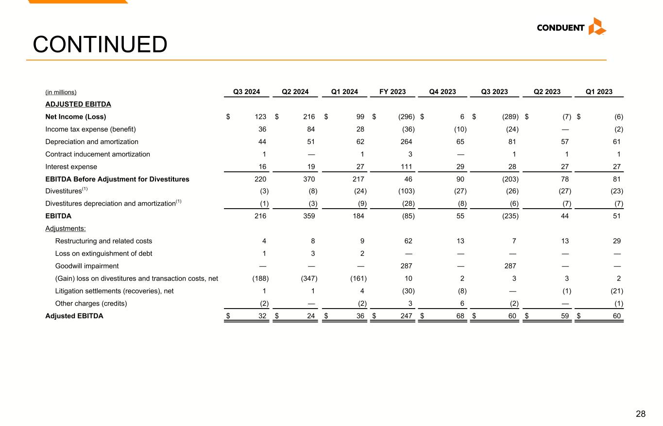 27 CONTINUED (in millions) Q3 2024 Q2 2024 Q1 2024 FY 2023 Q4 2023 Q3 2023 Q2 2023 Q1 2023 ADJUSTED EFFECTIVE TAX Income (Loss) Before Income Taxes $ 159 $ 300 $ 127 $ (332) $ (4) $ (313) $ (7) $ (8) Adjustment: Total Non-GAAP Adjustments (183) (333) (147) 339 15 296 17 11 Adjusted PBT Before Adjustment for Divestitures (24) (33) (20) 7 11 (17) 10 3 Divestitures(1) (3) (8) (24) (103) (27) (26) (27) (23) Adjusted PBT $ (27) $ (41) $ (44) $ (96) $ (16) $ (43) $ (17) $ (20) Income tax expense (benefit) $ 36 $ 84 $ 28 $ (36) $ (10) $ (24) $ — $ (2) Income tax adjustments(3) (39) (92) (32) 43 11 25 4 3 Adjusted Income Tax Expense (Benefit) (3) (8) (4) 7 1 1 4 1 Adjusted Net Income (Loss) Before Adjustment for Divestitures (21) (25) (16) — 10 (18) 6 2 Divestitures(1) (3) (8) (24) (103) (27) (26) (27) (23) Adjusted Net Income (Loss) $ (24) $ (33) $ (40) $ (103) $ (17) $ (44) $ (21) $ (21) ADJUSTED OPERATING INCOME (LOSS) Income (Loss) Before Income Taxes $ 159 $ 300 $ 127 $ (332) $ (4) $ (313) $ (7) $ (8) Adjustment: Total non-GAAP adjustments (183) (333) (147) 339 15 296 17 11 Interest expense 16 19 27 111 29 28 27 27 Adjusted Operating Income (Loss) Before Adjustment for Divestitures (8) (14) 7 118 40 11 37 30 Divestitures(1) (3) (8) (24) (103) (27) (26) (27) (23) Adjusted Operating Income (Loss) $ (11) $ (22) $ (17) $ 15 $ 13 $ (15) $ 10 $ 7