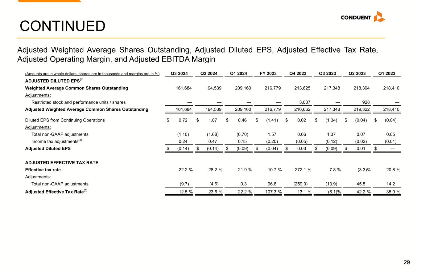 29 CONTINUED (Amounts are in whole dollars, shares are in thousands and margins are in %) Q3 2024 Q2 2024 Q1 2024 FY 2023 Q4 2023 Q3 2023 Q2 2023 Q1 2023 ADJUSTED DILUTED EPS(4) Weighted Average Common Shares Outstanding 161,684 194,539 209,160 216,779 213,625 217,348 218,394 218,410 Adjustments: Restricted stock and performance units / shares — — — — 3,037 — 928 — Adjusted Weighted Average Common Shares Outstanding 161,684 194,539 209,160 216,779 216,662 217,348 219,322 218,410 Diluted EPS from Continuing Operations $ 0.72 $ 1.07 $ 0.46 $ (1.41) $ 0.02 $ (1.34) $ (0.04) $ (0.04) Adjustments: Total non-GAAP adjustments (1.10) (1.68) (0.70) 1.57 0.06 1.37 0.07 0.05 Income tax adjustments(3) 0.24 0.47 0.15 (0.20) (0.05) (0.12) (0.02) (0.01) Adjusted Diluted EPS $ (0.14) $ (0.14) $ (0.09) $ (0.04) $ 0.03 $ (0.09) $ 0.01 $ — ADJUSTED EFFECTIVE TAX RATE Effective tax rate 22.2 % 28.2 % 21.9 % 10.7 % 272.1 % 7.8 % (3.3) % 20.8 % Adjustments: Total non-GAAP adjustments (9.7) (4.6) 0.3 96.6 (259.0) (13.9) 45.5 14.2 Adjusted Effective Tax Rate(3) 12.5 % 23.6 % 22.2 % 107.3 % 13.1 % (6.1) % 42.2 % 35.0 % Adjusted Weighted Average Shares Outstanding, Adjusted Diluted EPS, Adjusted Effective Tax Rate, Adjusted Operating Margin, and Adjusted EBITDA Margin