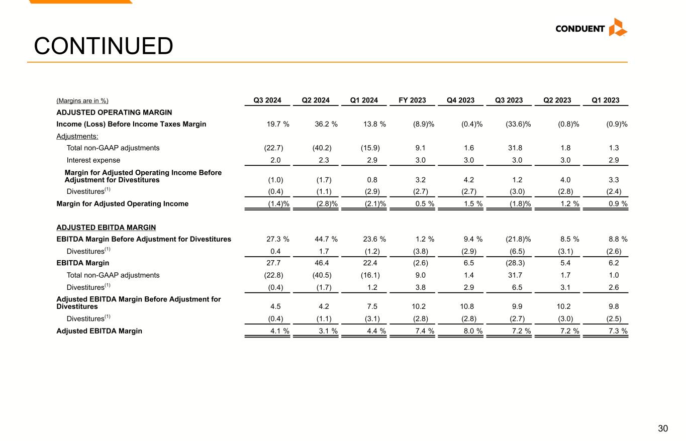 30 (Margins are in %) Q3 2024 Q2 2024 Q1 2024 FY 2023 Q4 2023 Q3 2023 Q2 2023 Q1 2023 ADJUSTED OPERATING MARGIN Income (Loss) Before Income Taxes Margin 19.7 % 36.2 % 13.8 % (8.9) % (0.4) % (33.6) % (0.8) % (0.9) % Adjustments: Total non-GAAP adjustments (22.7) (40.2) (15.9) 9.1 1.6 31.8 1.8 1.3 Interest expense 2.0 2.3 2.9 3.0 3.0 3.0 3.0 2.9 Margin for Adjusted Operating Income Before Adjustment for Divestitures (1.0) (1.7) 0.8 3.2 4.2 1.2 4.0 3.3 Divestitures(1) (0.4) (1.1) (2.9) (2.7) (2.7) (3.0) (2.8) (2.4) Margin for Adjusted Operating Income (1.4) % (2.8) % (2.1) % 0.5 % 1.5 % (1.8) % 1.2 % 0.9 % ADJUSTED EBITDA MARGIN EBITDA Margin Before Adjustment for Divestitures 27.3 % 44.7 % 23.6 % 1.2 % 9.4 % (21.8) % 8.5 % 8.8 % Divestitures(1) 0.4 1.7 (1.2) (3.8) (2.9) (6.5) (3.1) (2.6) EBITDA Margin 27.7 46.4 22.4 (2.6) 6.5 (28.3) 5.4 6.2 Total non-GAAP adjustments (22.8) (40.5) (16.1) 9.0 1.4 31.7 1.7 1.0 Divestitures(1) (0.4) (1.7) 1.2 3.8 2.9 6.5 3.1 2.6 Adjusted EBITDA Margin Before Adjustment for Divestitures 4.5 4.2 7.5 10.2 10.8 9.9 10.2 9.8 Divestitures(1) (0.4) (1.1) (3.1) (2.8) (2.8) (2.7) (3.0) (2.5) Adjusted EBITDA Margin 4.1 % 3.1 % 4.4 % 7.4 % 8.0 % 7.2 % 7.2 % 7.3 % CONTINUED