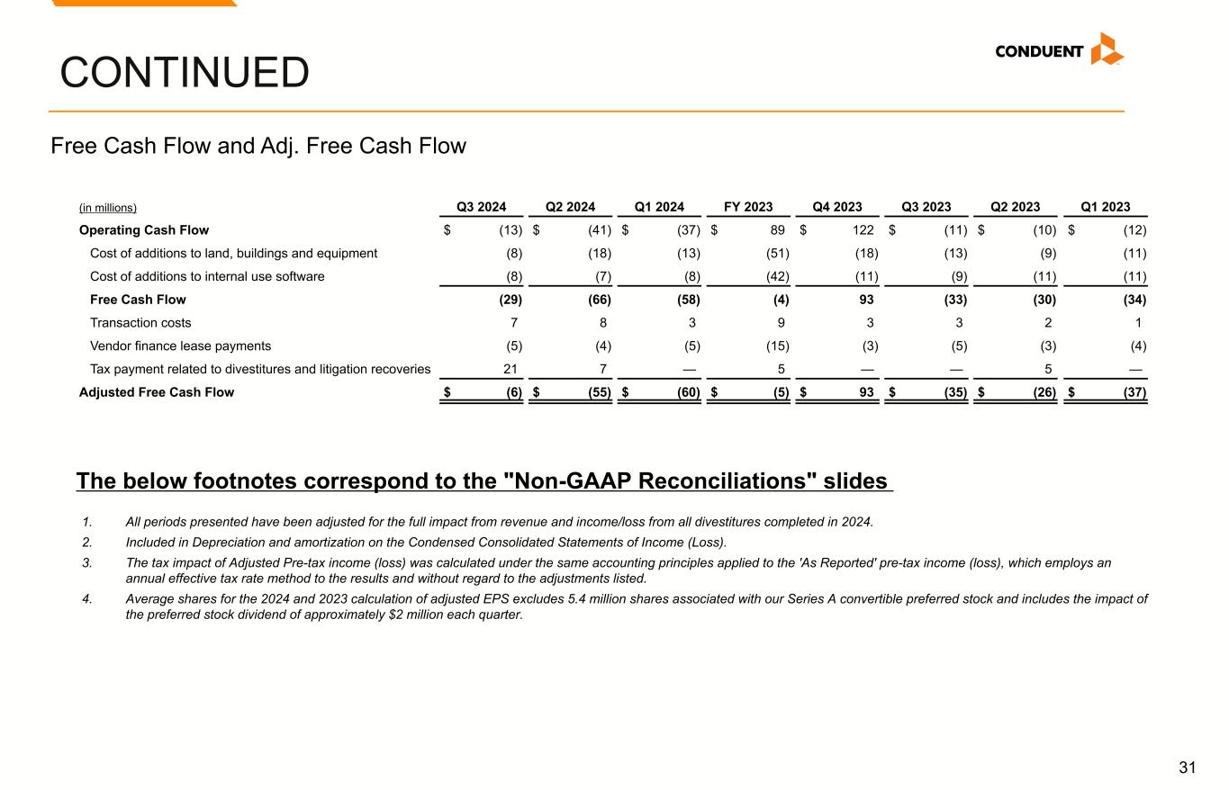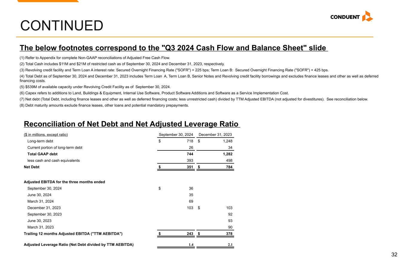31 CONTINUED (in millions) Q3 2024 Q2 2024 Q1 2024 FY 2023 Q4 2023 Q3 2023 Q2 2023 Q1 2023 Operating Cash Flow $ (13) $ (41) $ (37) $ 89 $ 122 $ (11) $ (10) $ (12) Cost of additions to land, buildings and equipment (8) (18) (13) (51) (18) (13) (9) (11) Cost of additions to internal use software (8) (7) (8) (42) (11) (9) (11) (11) Free Cash Flow (29) (66) (58) (4) 93 (33) (30) (34) Transaction costs 7 8 3 9 3 3 2 1 Vendor finance lease payments (5) (4) (5) (15) (3) (5) (3) (4) Tax payment related to divestitures and litigation recoveries 21 7 — 5 — — 5 — Adjusted Free Cash Flow $ (6) $ (55) $ (60) $ (5) $ 93 $ (35) $ (26) $ (37) Free Cash Flow and Adj. Free Cash Flow The below footnotes correspond to the "Non-GAAP Reconciliations" slides 1. All periods presented have been adjusted for the full impact from revenue and income/loss from all divestitures completed in 2024. 2. Included in Depreciation and amortization on the Condensed Consolidated Statements of Income (Loss). 3. The tax impact of Adjusted Pre-tax income (loss) was calculated under the same accounting principles applied to the 'As Reported' pre-tax income (loss), which employs an annual effective tax rate method to the results and without regard to the adjustments listed. 4. Average shares for the 2024 and 2023 calculation of adjusted EPS excludes 5.4 million shares associated with our Series A convertible preferred stock and includes the impact of the preferred stock dividend of approximately $2 million each quarter.