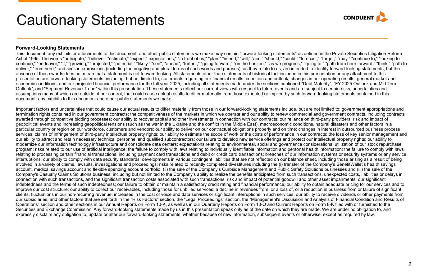 2 Forward-Looking Statements This document, any exhibits or attachments to this document, and other public statements we make may contain “forward-looking statements” as defined in the Private Securities Litigation Reform Act of 1995. The words “anticipate,” “believe,” “estimate,” “expect,” expectations," "in front of us," "plan," “intend,” “will,” “aim,” “should,” “could,” “forecast,” “target,” “may,” "continue to," "looking to continue," "endeavor," "if,” “growing,” “projected,” “potential,” “likely,” "see", "ahead", "further," "going forward," "on the horizon," "as we progress," "going to," "path from here forward," "think," "path to deliver," "from here," and similar expressions (including the negative and plural forms of such words and phrases), as they relate to us, are intended to identify forward-looking statements, but the absence of these words does not mean that a statement is not forward looking. All statements other than statements of historical fact included in this presentation or any attachment to this presentation are forward-looking statements, including, but not limited to, statements regarding our financial results, condition and outlook; changes in our operating results; general market and economic conditions; and our projected financial performance for the full year 2025, including all statements made under the sections captioned "Debt Maturity", “FY 2025 Outlook and Mid-Tern Outlook”, and "Segment Revenue Trend" within this presentation. These statements reflect our current views with respect to future events and are subject to certain risks, uncertainties and assumptions many of which are outside of our control, that could cause actual results to differ materially from those expected or implied by such forward-looking statements contained in this document, any exhibits to this document and other public statements we make. Important factors and uncertainties that could cause our actual results to differ materially from those in our forward-looking statements include, but are not limited to: government appropriations and termination rights contained in our government contracts; the competitiveness of the markets in which we operate and our ability to renew commercial and government contracts, including contracts awarded through competitive bidding processes; our ability to recover capital and other investments in connection with our contracts; our reliance on third-party providers; risk and impact of geopolitical events and increasing geopolitical tensions (such as the war in the Ukraine and the conflict in the Middle East), macroeconomic conditions, natural disasters and other factors in a particular country or region on our workforce, customers and vendors; our ability to deliver on our contractual obligations properly and on time; changes in interest in outsourced business process services; claims of infringement of third-party intellectual property rights; our ability to estimate the scope of work or the costs of performance in our contracts; the loss of key senior management and our ability to attract and retain necessary technical personnel and qualified subcontractors; our failure to develop new service offerings and protect our intellectual property rights; our ability to modernize our information technology infrastructure and consolidate data centers; expectations relating to environmental, social and governance considerations; utilization of our stock repurchase program; risks related to our use of artificial intelligence; the failure to comply with laws relating to individually identifiable information and personal health information; the failure to comply with laws relating to processing certain financial transactions, including payment card transactions and debit or credit card transactions; breaches of our information systems or security systems or any service interruptions; our ability to comply with data security standards; developments in various contingent liabilities that are not reflected on our balance sheet, including those arising as a result of being involved in a variety of claims, lawsuits, investigations and proceedings; risks related to recently completed divestitures including the (i) transfer of the Company’s BenefitWallet’s health savings account, medical savings account and flexible spending account portfolio, (ii) the sale of the Company’s Curbside Management and Public Safety Solutions businesses and (iii) the sale of the Company's Casualty Claims Solutions business, including but not limited to the Company’s ability to realize the benefits anticipated from such transactions, unexpected costs, liabilities or delays in connection with such transactions, and the significant transaction costs associated with such transactions; risk and impact of potential goodwill and other asset impairments; our significant indebtedness and the terms of such indebtedness; our failure to obtain or maintain a satisfactory credit rating and financial performance; our ability to obtain adequate pricing for our services and to improve our cost structure; our ability to collect our receivables, including those for unbilled services; a decline in revenues from, or a loss of, or a reduction in business from or failure of significant clients; fluctuations in our non-recurring revenue; increases in the cost of voice and data services or significant interruptions in such services; our ability to receive dividends or other payments from our subsidiaries; and other factors that are set forth in the “Risk Factors” section, the “Legal Proceedings” section, the “Management's Discussion and Analysis of Financial Condition and Results of Operations” section and other sections in our Annual Reports on Form 10-K, as well as in our Quarterly Reports on Form 10-Q and Current Reports on Form 8-K filed with or furnished to the Securities and Exchange Commission. Any forward-looking 