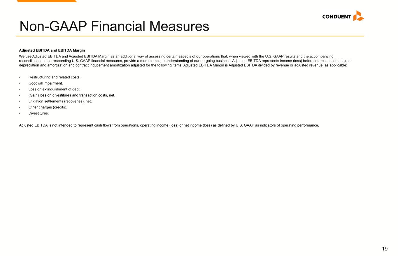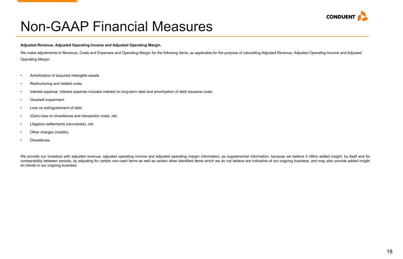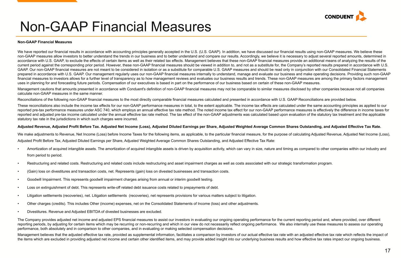 17 Non-GAAP Financial Measures We have reported our financial results in accordance with accounting principles generally accepted in the U.S. (U.S. GAAP). In addition, we have discussed our financial results using non-GAAP measures. We believe these non-GAAP measures allow investors to better understand the trends in our business and to better understand and compare our results. Accordingly, we believe it is necessary to adjust several reported amounts, determined in accordance with U.S. GAAP, to exclude the effects of certain items as well as their related tax effects. Management believes that these non-GAAP financial measures provide an additional means of analyzing the results of the current period against the corresponding prior period. However, these non-GAAP financial measures should be viewed in addition to, and not as a substitute for, the Company’s reported results prepared in accordance with U.S. GAAP. Our non-GAAP financial measures are not meant to be considered in isolation or as a substitute for comparable U.S. GAAP measures and should be read only in conjunction with our Consolidated Financial Statements prepared in accordance with U.S. GAAP. Our management regularly uses our non-GAAP financial measures internally to understand, manage and evaluate our business and make operating decisions. Providing such non-GAAP financial measures to investors allows for a further level of transparency as to how management reviews and evaluates our business results and trends. These non-GAAP measures are among the primary factors management uses in planning for and forecasting future periods. Compensation of our executives is based in part on the performance of our business based on certain of these non-GAAP measures. Management cautions that amounts presented in accordance with Conduent's definition of non-GAAP financial measures may not be comparable to similar measures disclosed by other companies because not all companies calculate non-GAAP measures in the same manner. Reconciliations of the following non-GAAP financial measures to the most directly comparable financial measures calculated and presented in accordance with U.S. GAAP Reconciliations are provided below. These reconciliations also include the income tax effects for our non-GAAP performance measures in total, to the extent applicable. The income tax effects are calculated under the same accounting principles as applied to our reported pre-tax performance measures under ASC 740, which employs an annual effective tax rate method. The noted income tax effect for our non-GAAP performance measures is effectively the difference in income taxes for reported and adjusted pre-tax income calculated under the annual effective tax rate method. The tax effect of the non-GAAP adjustments was calculated based upon evaluation of the statutory tax treatment and the applicable statutory tax rate in the jurisdictions in which such charges were incurred. Adjusted Revenue, Adjusted Profit Before Tax. Adjusted Net Income (Loss), Adjusted Diluted Earnings per Share, Adjusted Weighted Average Common Shares Outstanding, and Adjusted Effective Tax Rate. We make adjustments to Revenue, Net Income (Loss) before Income Taxes for the following items, as applicable, to the particular financial measure, for the purpose of calculating Adjusted Revenue, Adjusted Net Income (Loss), Adjusted Profit Before Tax, Adjusted Diluted Earnings per Share, Adjusted Weighted Average Common Shares Outstanding, and Adjusted Effective Tax Rate: • Amortization of acquired intangible assets. The amortization of acquired intangible assets is driven by acquisition activity, which can vary in size, nature and timing as compared to other companies within our industry and from period to period. • Restructuring and related costs. Restructuring and related costs include restructuring and asset impairment charges as well as costs associated with our strategic transformation program. • (Gain) loss on divestitures and transaction costs, net. Represents (gain) loss on divested businesses and transaction costs. • Goodwill Impairment. This represents goodwill impairment charges arising from annual or interim goodwill testing. • Loss on extinguishment of debt. This represents write-off related debt issuance costs related to prepayments of debt. • Litigation settlements (recoveries), net. Litigation settlements (recoveries), net represents provisions for various matters subject to litigation. • Other charges (credits). This includes Other (income) expenses, net on the Consolidated Statements of Income (loss) and other adjustments. • Divestitures. Revenue and Adjusted EBITDA of divested businesses are excluded. The Company provides adjusted net income and adjusted EPS financial measures to assist our investors in evaluating our ongoing operating performance for the current reporting period and, where provided, over different reporting periods, by adjusting for certain items which may be recurring or non-recurring and which in our view do not necessarily reflect ongoing performance. We also internally use these measures to assess our operating performance, both absolutely and in comparison to other companies, and in evaluating or making selected compensation decisions. Management believes that the adjusted effective tax rate, provided as supplemental information, facilitates a comparison by investors of our actual effective tax rate with an adjusted effective tax rate which reflects the impact of the items which are excluded in providing adjusted net income and certain other identified items, and may provide added insight into our underlying business results and how effective tax rates impact our ongoing business. Non-GAAP Financial Measures