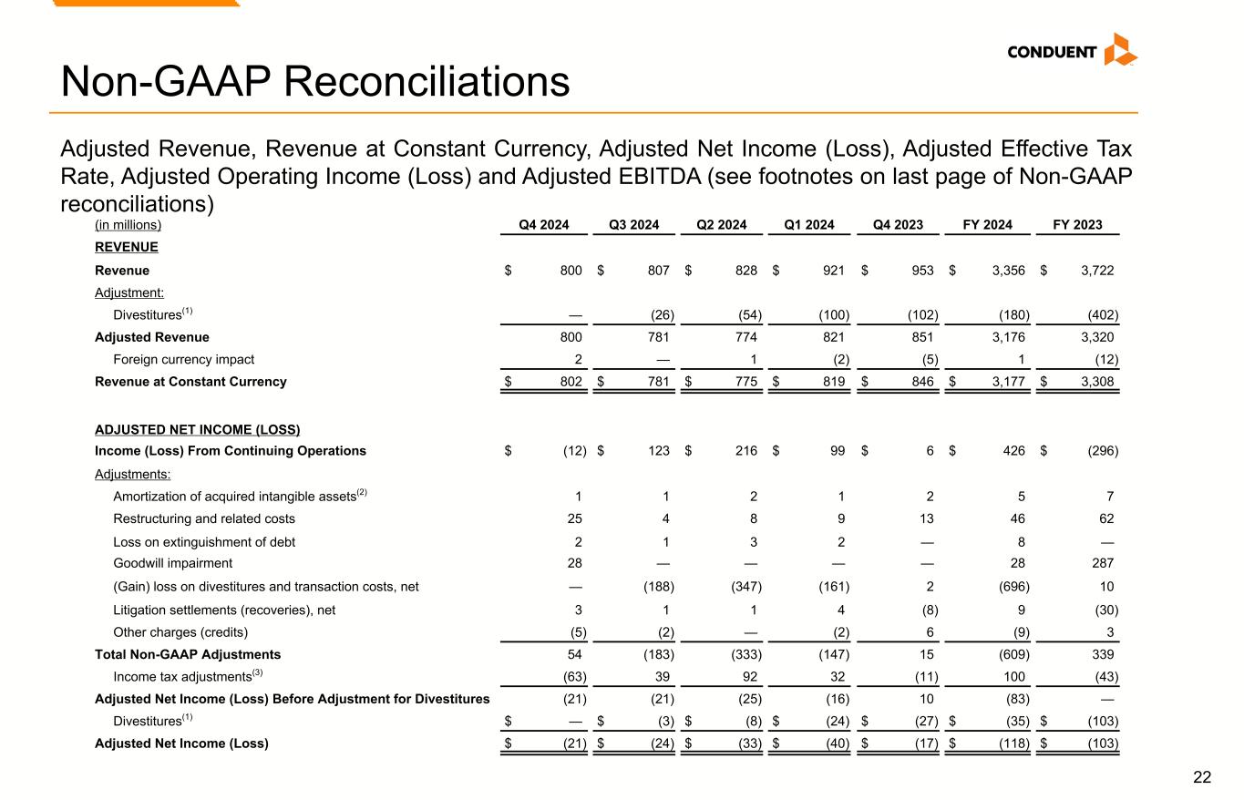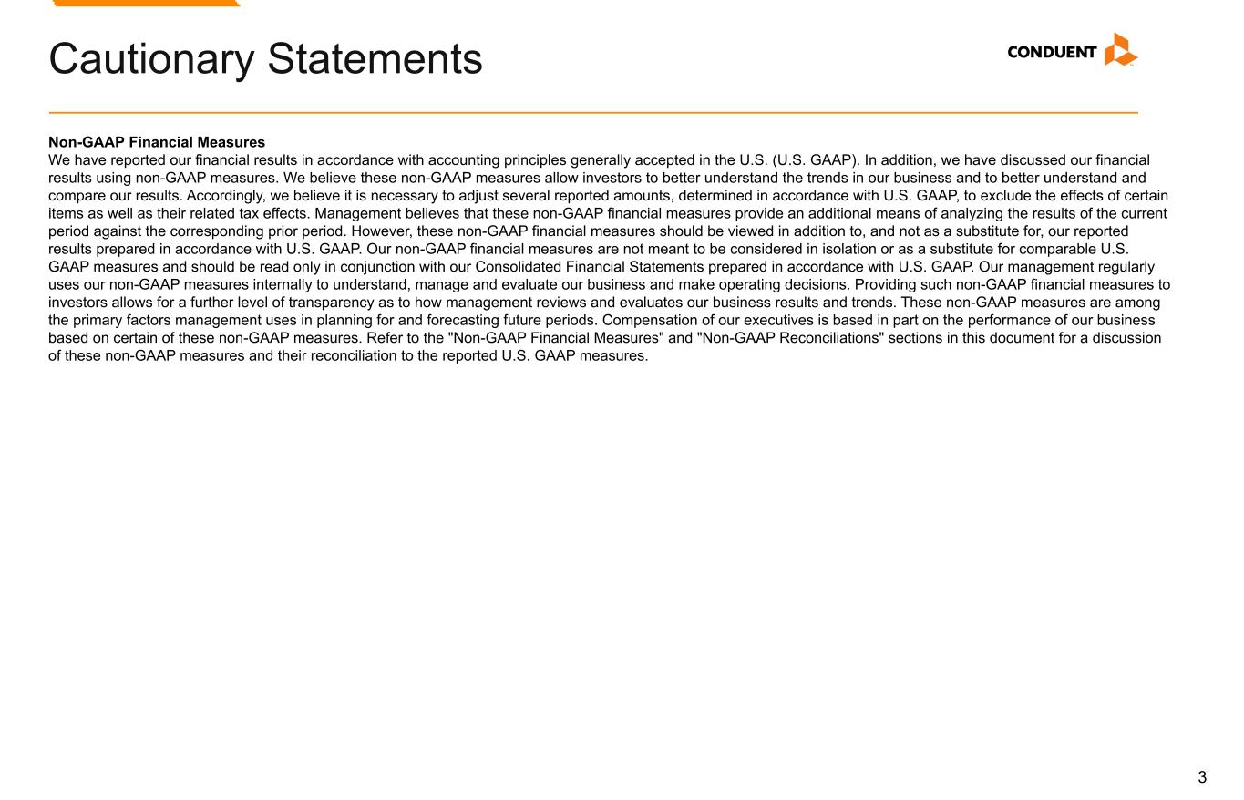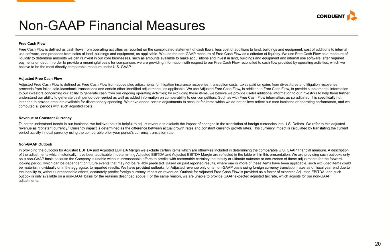 17 Non-GAAP Financial Measures We have reported our financial results in accordance with accounting principles generally accepted in the U.S. (U.S. GAAP). In addition, we have discussed our financial results using non-GAAP measures. We believe these non-GAAP measures allow investors to better understand the trends in our business and to better understand and compare our results. Accordingly, we believe it is necessary to adjust several reported amounts, determined in accordance with U.S. GAAP, to exclude the effects of certain items as well as their related tax effects. Management believes that these non-GAAP financial measures provide an additional means of analyzing the results of the current period against the corresponding prior period. However, these non-GAAP financial measures should be viewed in addition to, and not as a substitute for, the Company’s reported results prepared in accordance with U.S. GAAP. Our non-GAAP financial measures are not meant to be considered in isolation or as a substitute for comparable U.S. GAAP measures and should be read only in conjunction with our Consolidated Financial Statements prepared in accordance with U.S. GAAP. Our management regularly uses our non-GAAP financial measures internally to understand, manage and evaluate our business and make operating decisions. Providing such non-GAAP financial measures to investors allows for a further level of transparency as to how management reviews and evaluates our business results and trends. These non-GAAP measures are among the primary factors management uses in planning for and forecasting future periods. Compensation of our executives is based in part on the performance of our business based on certain of these non-GAAP measures. Management cautions that amounts presented in accordance with Conduent's definition of non-GAAP financial measures may not be comparable to similar measures disclosed by other companies because not all companies calculate non-GAAP measures in the same manner. Reconciliations of the following non-GAAP financial measures to the most directly comparable financial measures calculated and presented in accordance with U.S. GAAP Reconciliations are provided below. These reconciliations also include the income tax effects for our non-GAAP performance measures in total, to the extent applicable. The income tax effects are calculated under the same accounting principles as applied to our reported pre-tax performance measures under ASC 740, which employs an annual effective tax rate method. The noted income tax effect for our non-GAAP performance measures is effectively the difference in income taxes for reported and adjusted pre-tax income calculated under the annual effective tax rate method. The tax effect of the non-GAAP adjustments was calculated based upon evaluation of the statutory tax treatment and the applicable statutory tax rate in the jurisdictions in which such charges were incurred. Adjusted Revenue, Adjusted Profit Before Tax. Adjusted Net Income (Loss), Adjusted Diluted Earnings per Share, Adjusted Weighted Average Common Shares Outstanding, and Adjusted Effective Tax Rate. We make adjustments to Revenue, Net Income (Loss) before Income Taxes for the following items, as applicable, to the particular financial measure, for the purpose of calculating Adjusted Revenue, Adjusted Net Income (Loss), Adjusted Profit Before Tax, Adjusted Diluted Earnings per Share, Adjusted Weighted Average Common Shares Outstanding, and Adjusted Effective Tax Rate: • Amortization of acquired intangible assets. The amortization of acquired intangible assets is driven by acquisition activity, which can vary in size, nature and timing as compared to other companies within our industry and from period to period. • Restructuring and related costs. Restructuring and related costs include restructuring and asset impairment charges as well as costs associated with our strategic transformation program. • (Gain) loss on divestitures and transaction costs, net. Represents (gain) loss on divested businesses and transaction costs. • Goodwill Impairment. This represents goodwill impairment charges arising from annual or interim goodwill testing. • Loss on extinguishment of debt. This represents write-off related debt issuance costs related to prepayments of debt. • Litigation settlements (recoveries), net. Litigation settlements (recoveries), net represents provisions for various matters subject to litigation. • Other charges (credits). This includes Other (income) expenses, net on the Consolidated Statements of Income (loss) and other adjustments. • Divestitures. Revenue and Adjusted EBITDA of divested businesses are excluded. The Company provides adjusted net income and adjusted EPS financial measures to assist our investors in evaluating our ongoing operating performance for the current reporting period and, where provided, over different reporting periods, by adjusting for certain items which may be recurring or non-recurring and which in our view do not necessarily reflect ongoing performance. We also internally use these measures to assess our operating performance, both absolutely and in comparison to other companies, and in evaluating or making selected compensation decisions. Management believes that the adjusted effective tax rate, provided as supplemental information, facilitates a comparison by investors of our actual effective tax rate with an adjusted effective tax rate which reflects the impact of the items which are excluded in providing adjusted net income and certain other identified items, and may provide added insight into our underlying business results and how effective tax rates impact our ongoing business. Non-GAAP Financial Measures
