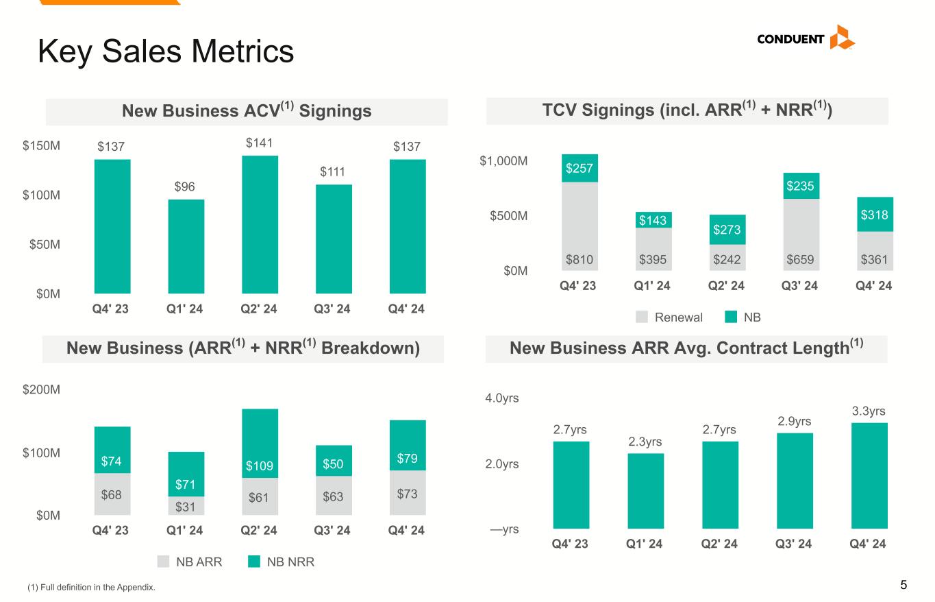 4 Q4 & Full Year 2024 Highlights (1) Refer to Appendix for complete Non-GAAP reconciliations of Adjusted Revenue, Adjusted EBITDA and Adjusted EBITDA Margin. (2) Full definition in the Appendix. (3) Trailing Twelve Months. Q4 & Full Year Results / Metrics • Adj. Revenue(1): $800M / $3,176M • Adj. EBITDA(1): $32M / $124M • Adj. EBITDA Margin(1): 4.0% / 3.9% • New business signings ACV(2): $137M / $485M • Net ARR Activity Impact (TTM)(2,3): $92M