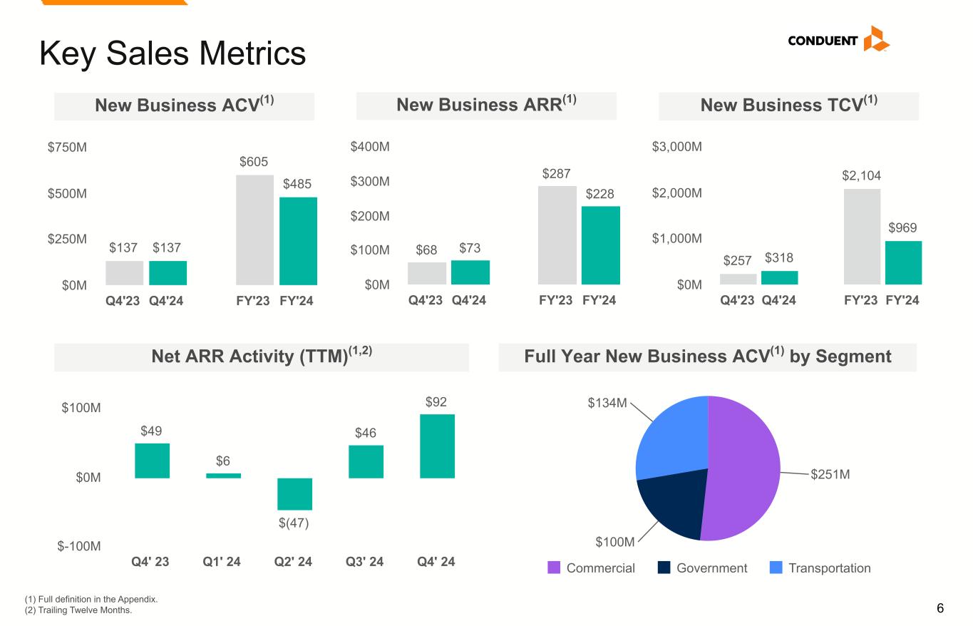 5 Key Sales Metrics TCV Signings (incl. ARR(1) + NRR(1)) $810 $395 $242 $659 $361 $257 $143 $273 $235 $318 Renewal NB Q4' 23 Q1' 24 Q2' 24 Q3' 24 Q4' 24 $0M $500M $1,000M New Business (ARR(1) + NRR(1) Breakdown) $68 $31 $61 $63 $73 $74 $71 $109 $50 $79 NB ARR NB NRR Q4' 23 Q1' 24 Q2' 24 Q3' 24 Q4' 24 $0M $100M $200M New Business ARR Avg. Contract Length(1) $137 $96 $141 $111 $137 Q4' 23 Q1' 24 Q2' 24 Q3' 24 Q4' 24 $0M $50M $100M $150M New Business ACV(1) Signings 2.7yrs 2.3yrs 2.7yrs 2.9yrs 3.3yrs Q4' 23 Q1' 24 Q2' 24 Q3' 24 Q4' 24 —yrs 2.0yrs 4.0yrs (1) Full definition in the Appendix.